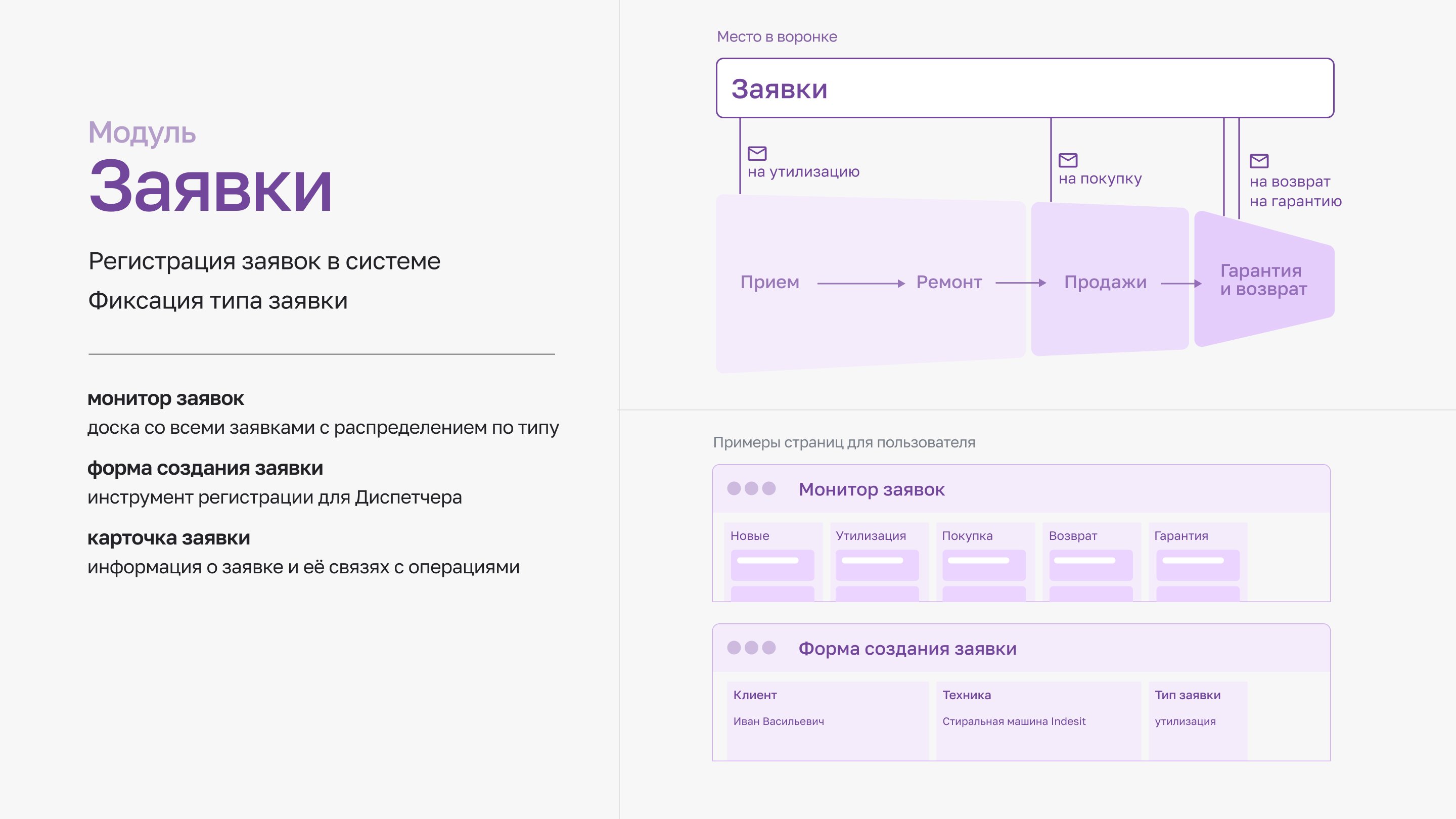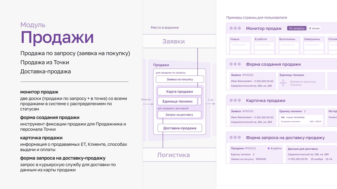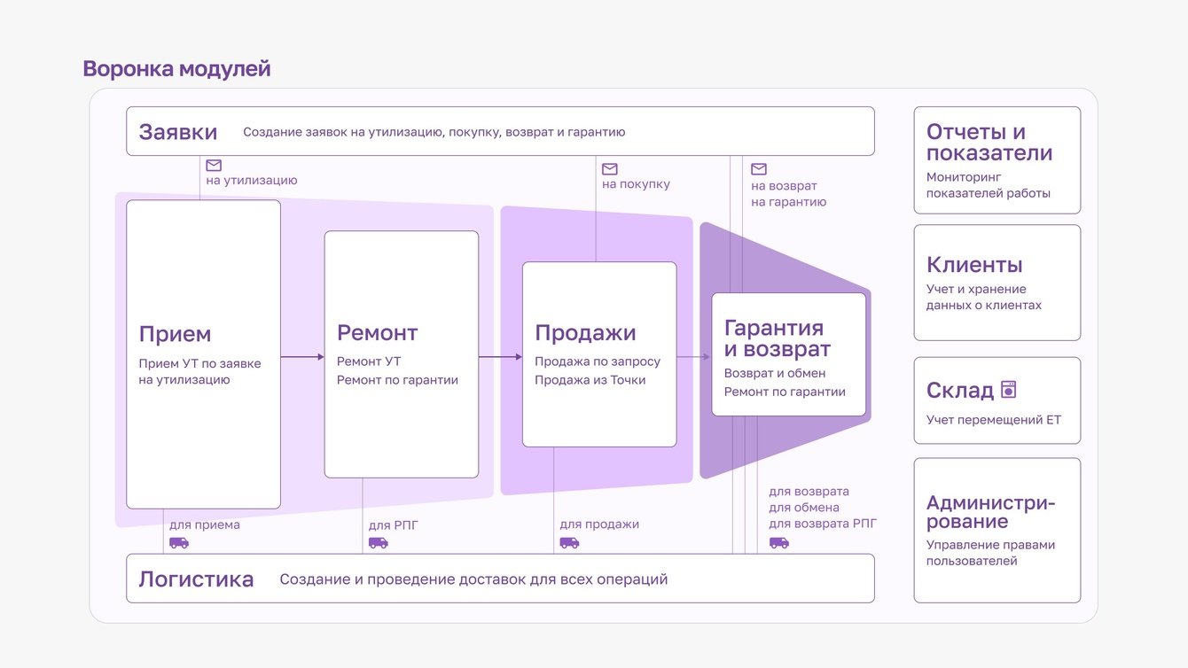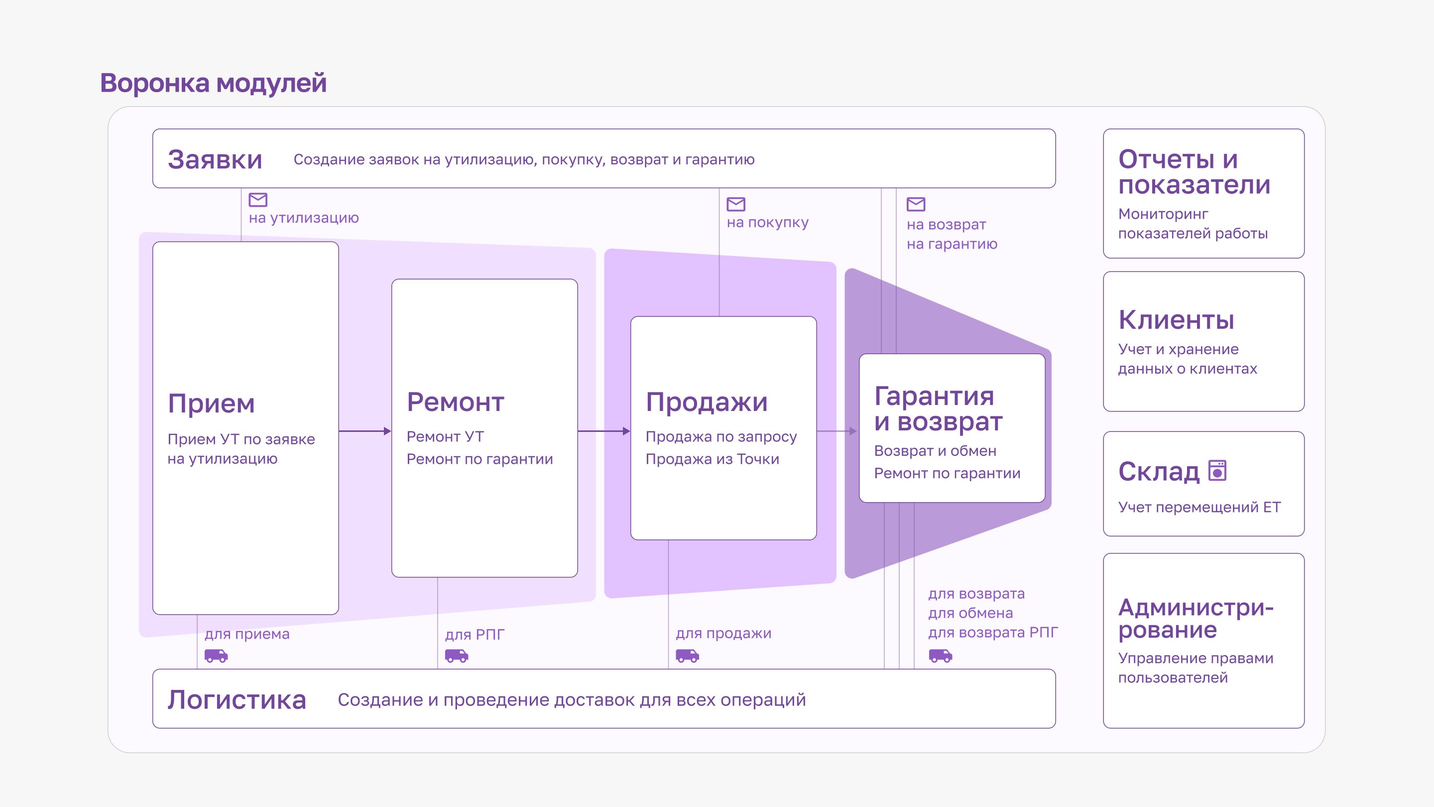 На основе проработанной модели процессов и сценариев мы собрали целостную архитектуру системы – в виде сквозной «воронки», отражающей путь техники внутри компании. Такая структура позволила визуализировать всю логику и задать каркас будущего цифрового решения.