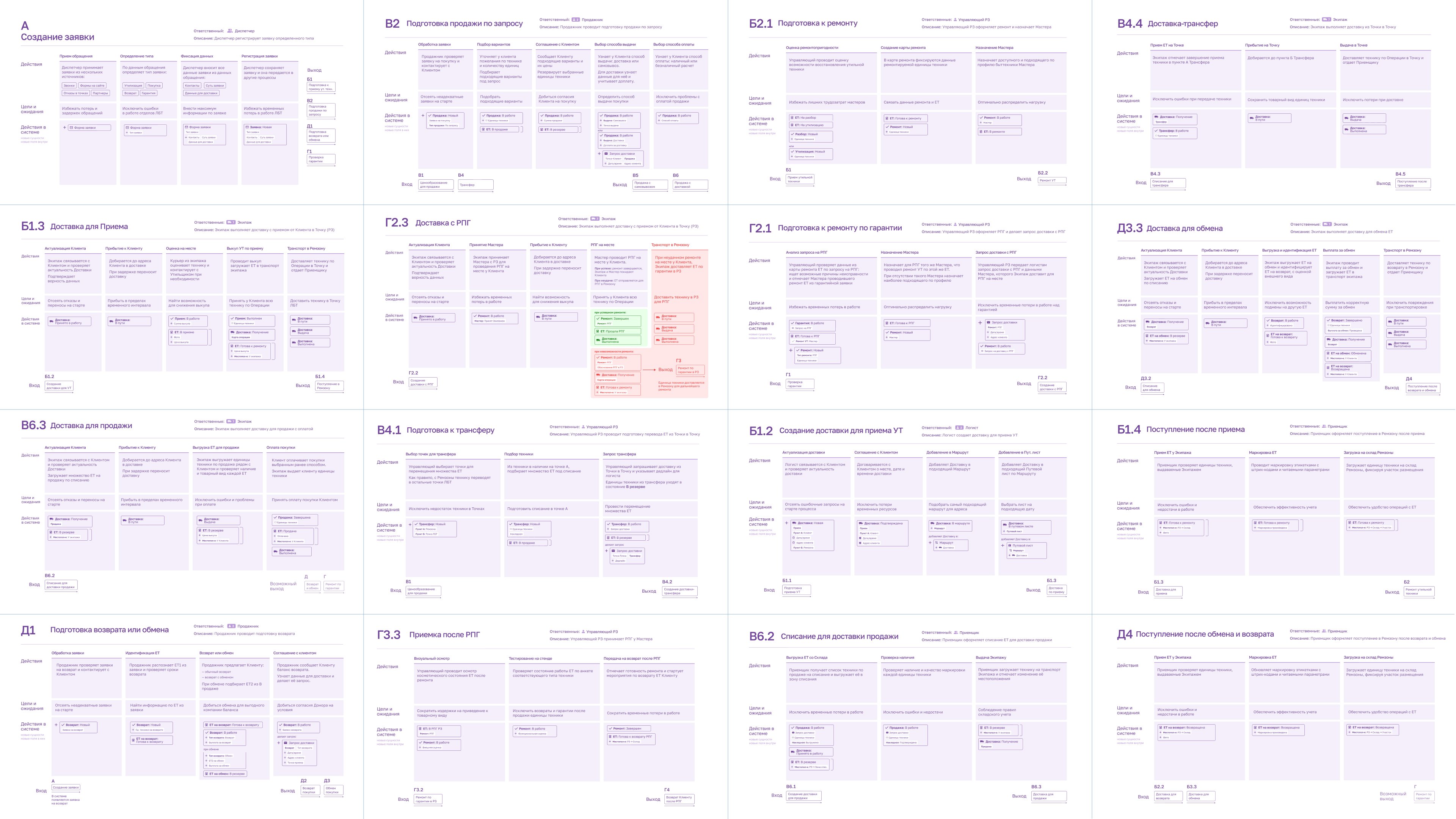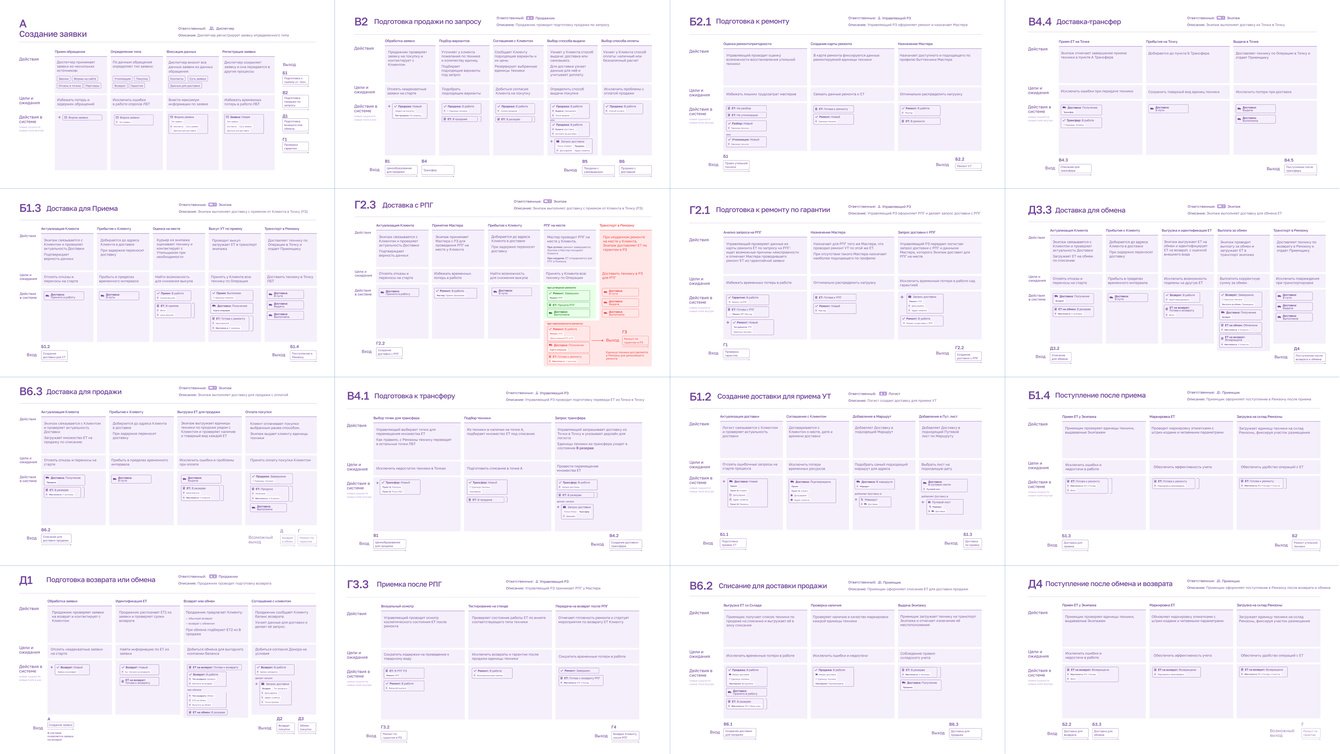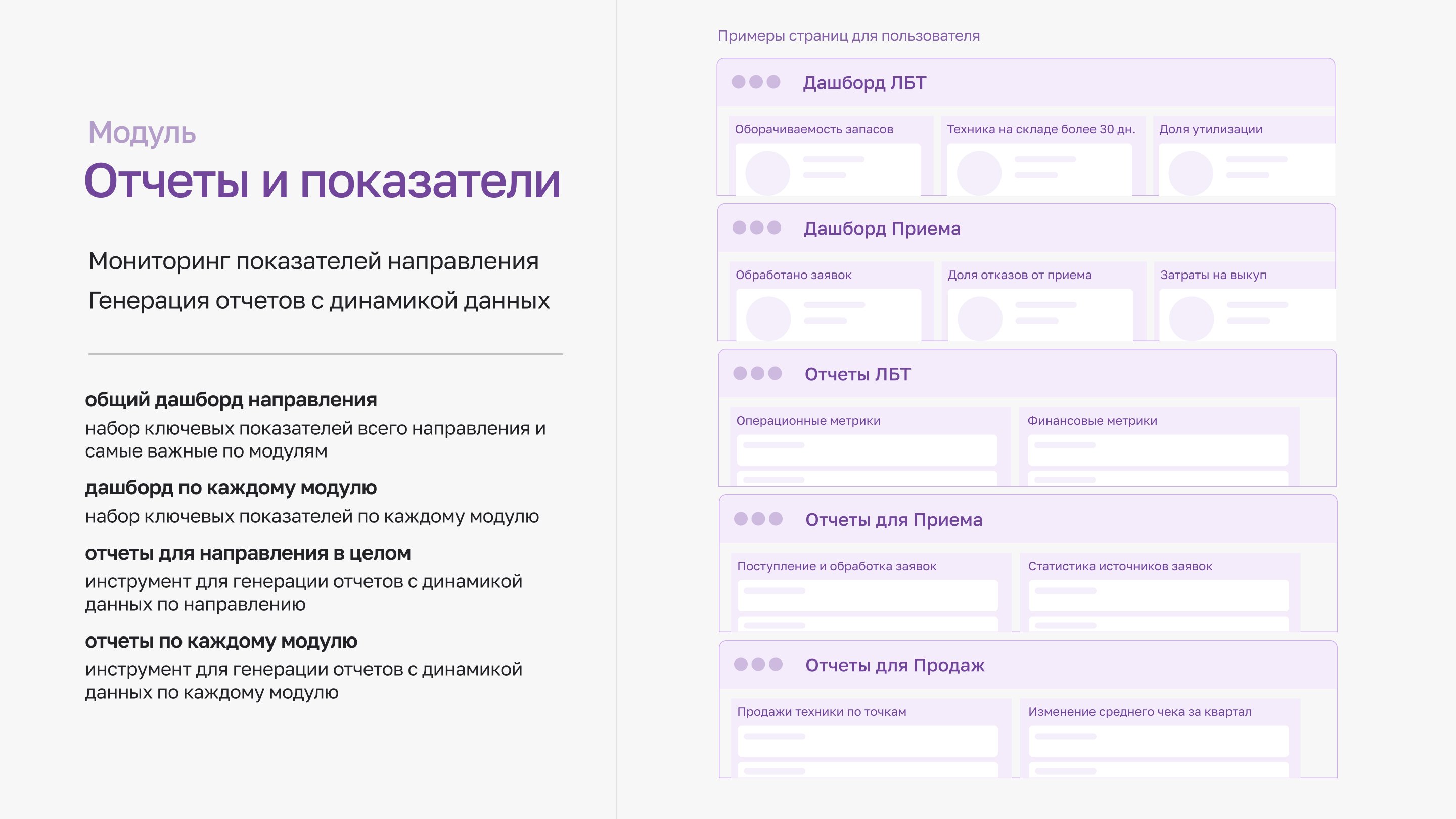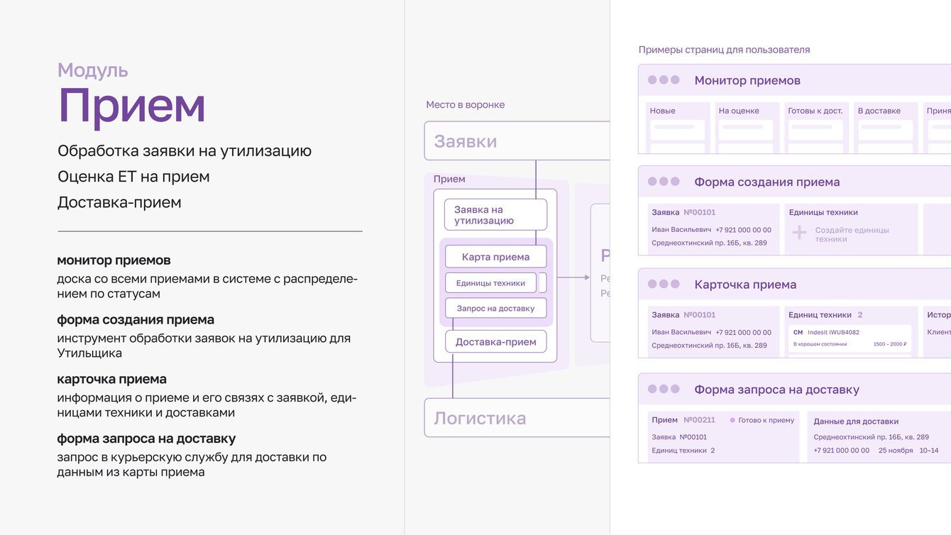 На основе проработанной модели процессов и сценариев мы собрали целостную архитектуру системы – в виде сквозной «воронки», отражающей путь техники внутри компании. Такая структура позволила визуализировать всю логику и задать каркас будущего цифрового решения.