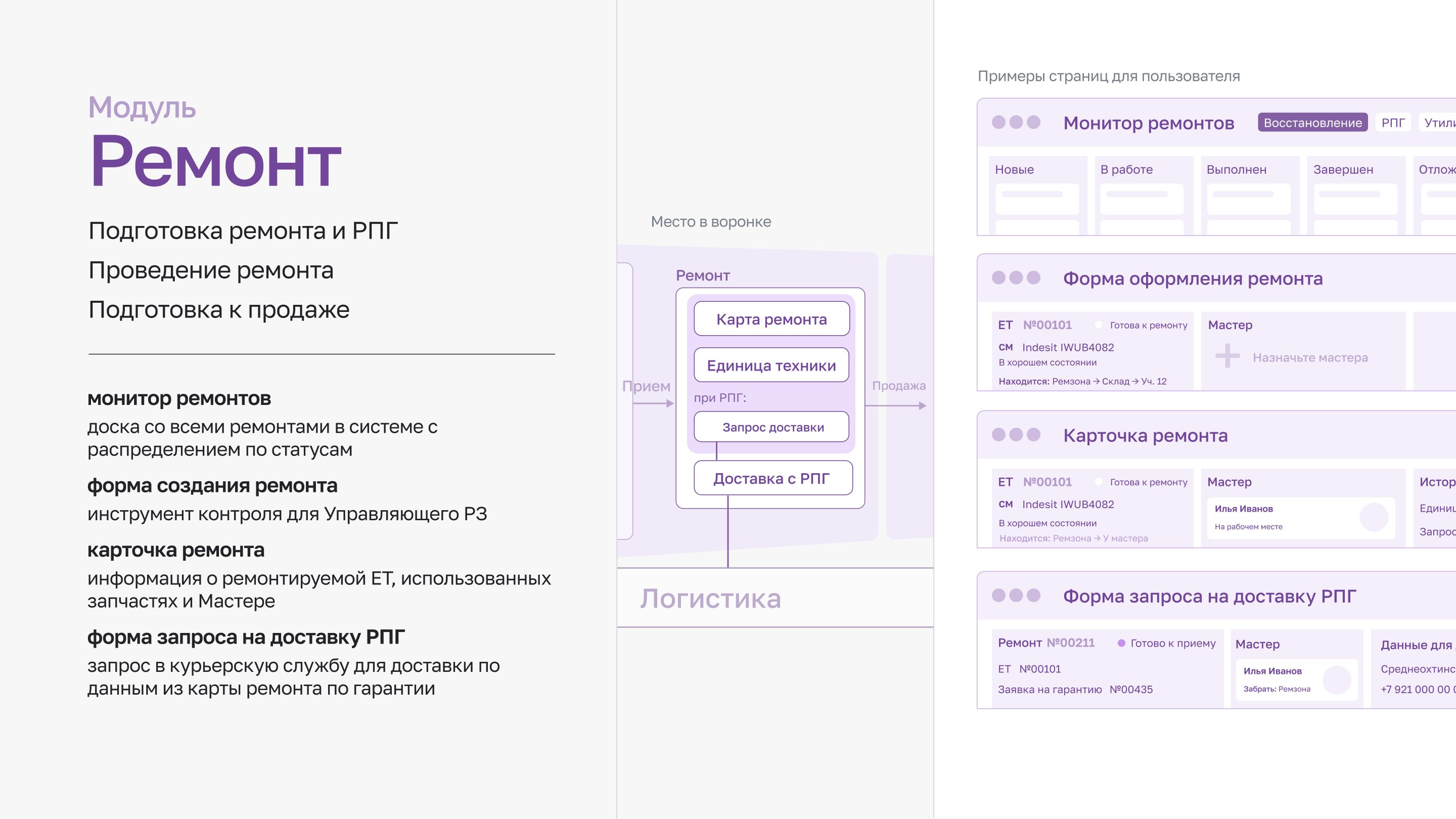 Спроектировали логику системы и интерфейсы так, чтобы система точно отражала реальные процессы – от первого обращения клиента до завершения гарантийного обслуживания.