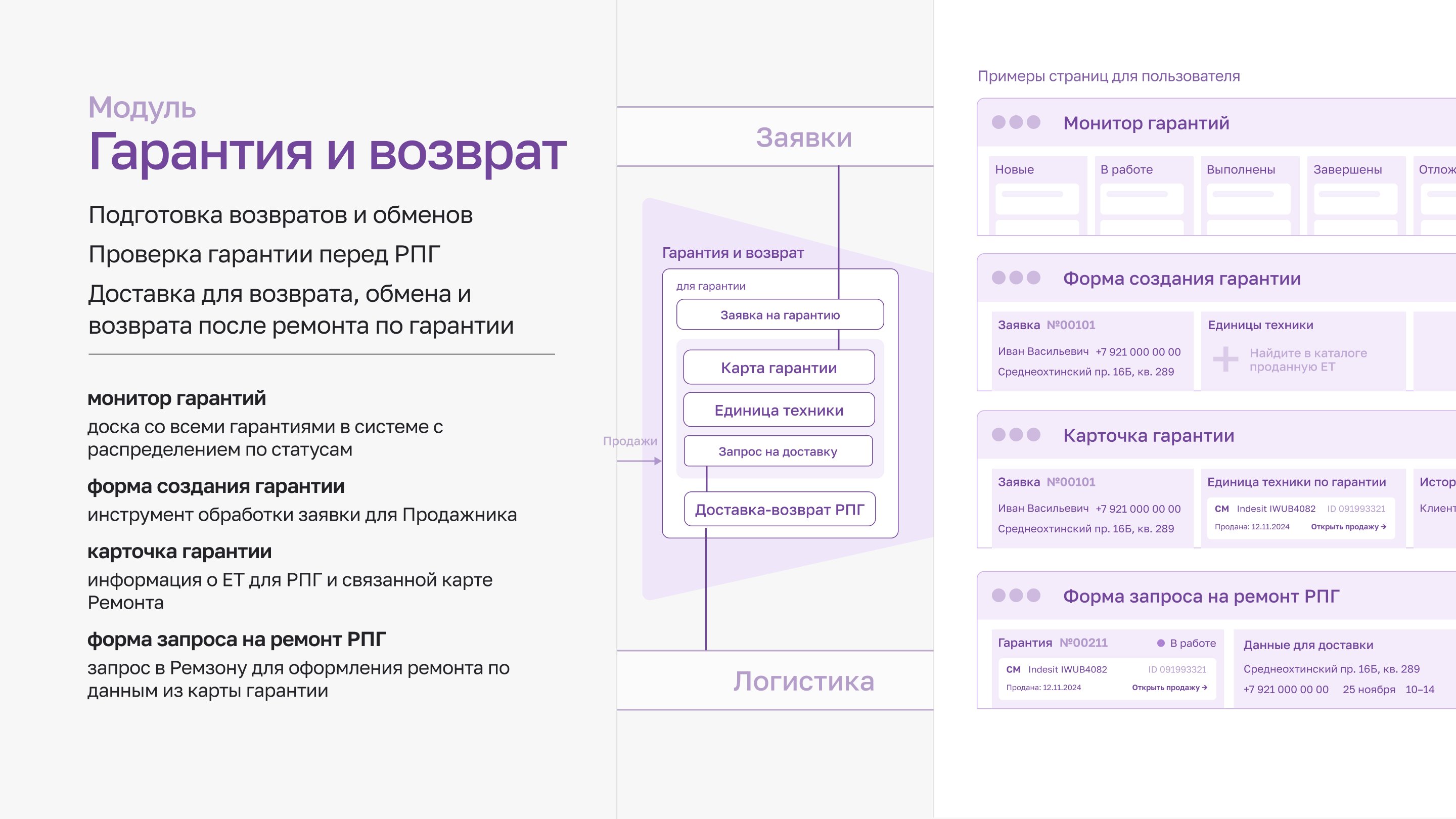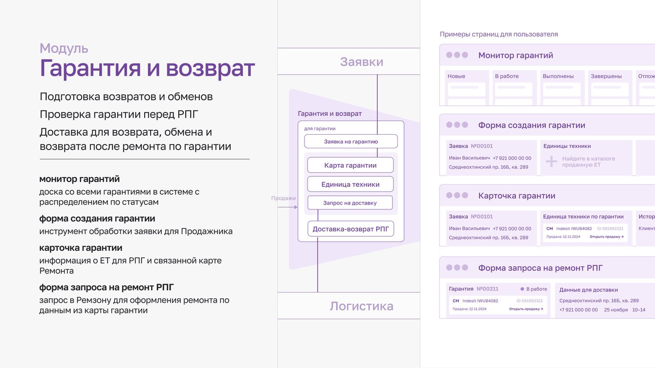 Отвечает за послепродажное сопровождение. Внутри блока обрабатываются возвраты, обмены и обращения по гарантии – с учётом сроков, причин и связей с предыдущими операциями.
