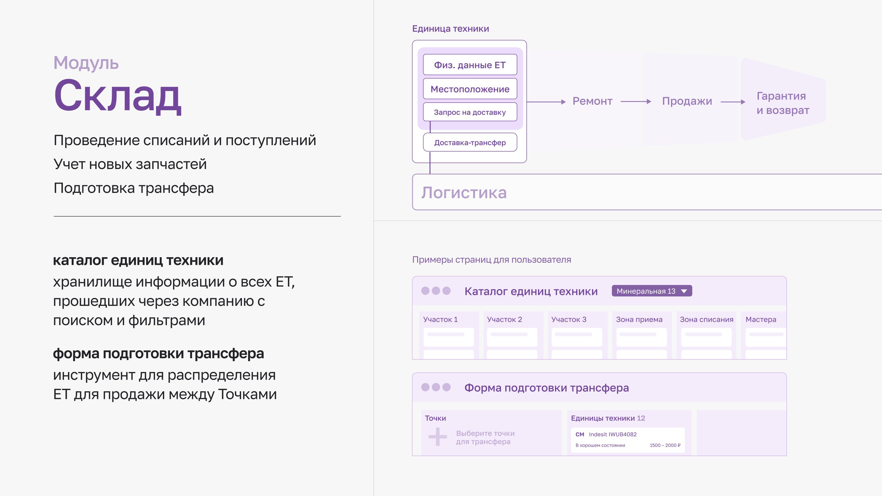Обеспечение точного учёта техники и запчастей на всех шагах. Поддерживает перемещение между зонами, оформление трансферов, инвентаризацию и автоматическое обновление статусов.