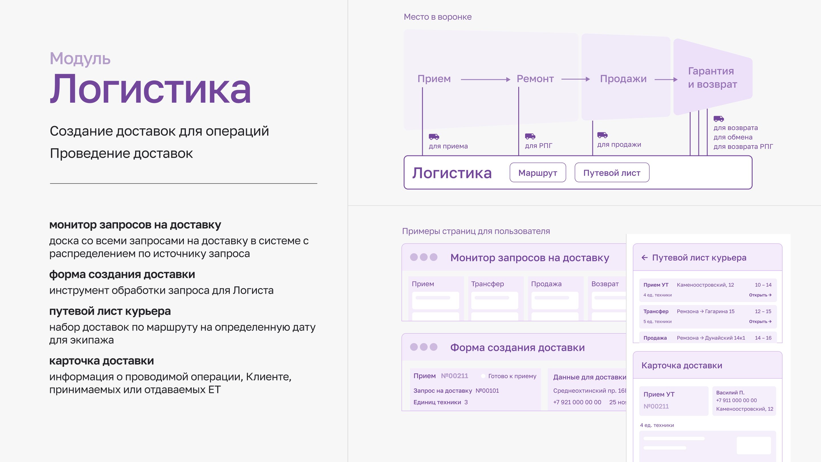 Помогает формировать маршруты, управлять доставками и координировать экипажи. Заявки из других модулей автоматически трансформируются в логистические задачи, создавая единый график перемещений техники.