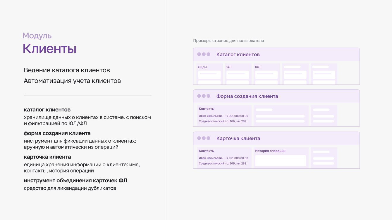 Собирает информацию о пользователях, хранит историю и помогает формировать аналитику для отдела продаж. Модуль исключает дубли и поддерживает актуальность и точность данных о клиентах.