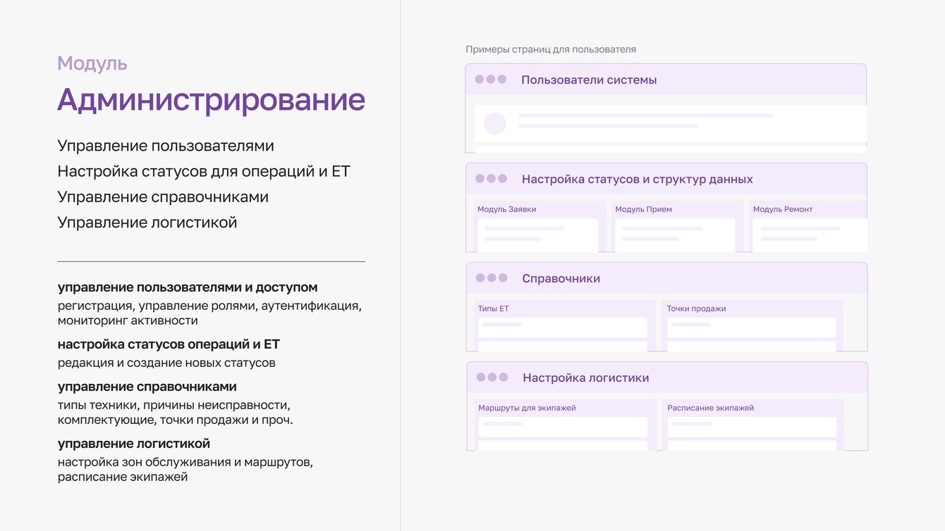 Управление доступами, ролями и настройками системы. Включает редактор справочников, настройку логистических маршрутов и мониторинг активности пользователей.