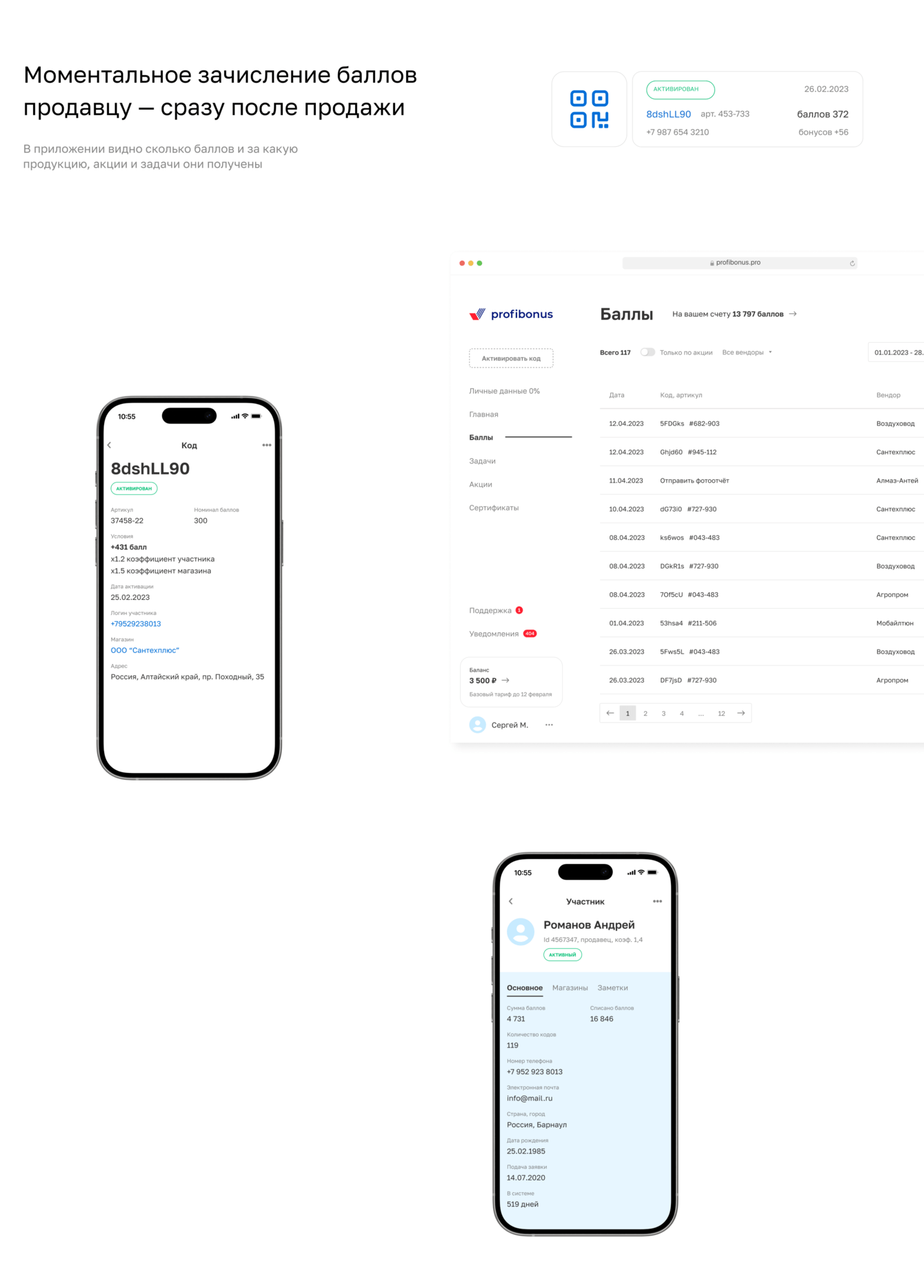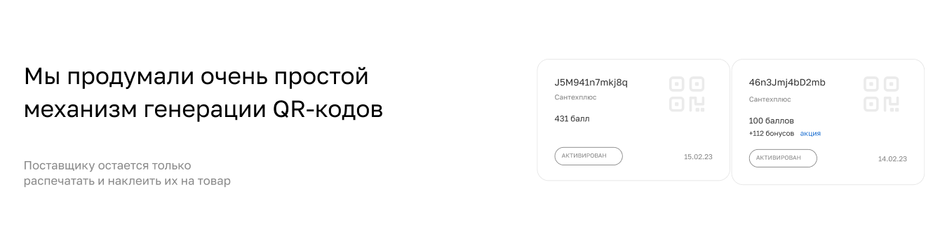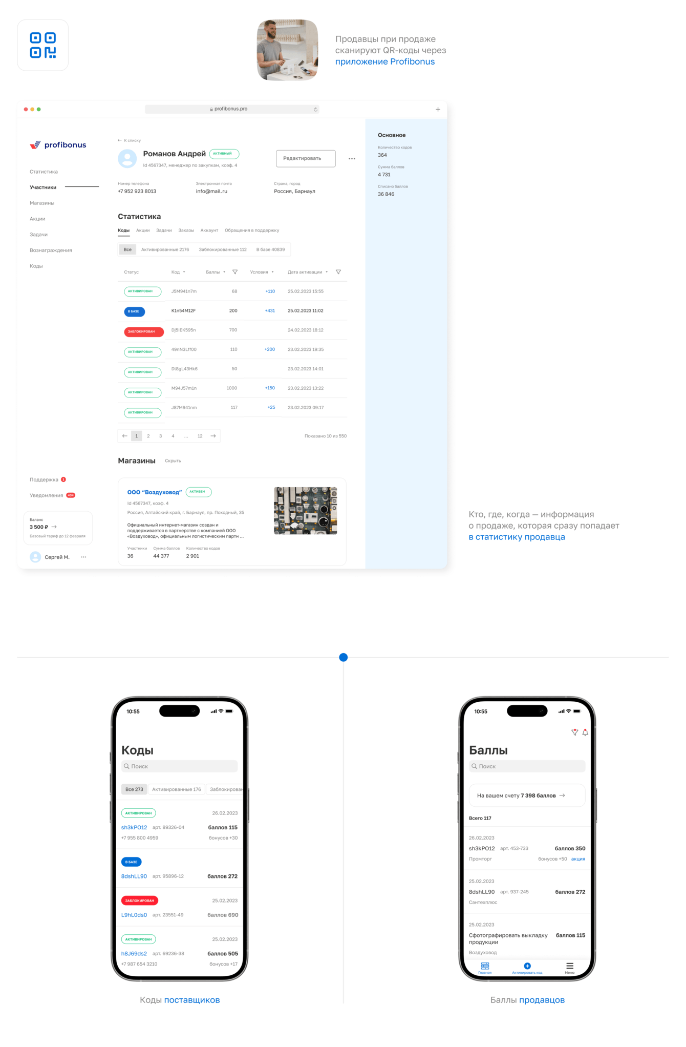 Сервис спроектирован так, чтобы продавцы могли легко активировать QR-коды, следить за акциями и выполнять задачи, зарабатывая бонусы и обменивая их на деньги или сертификаты