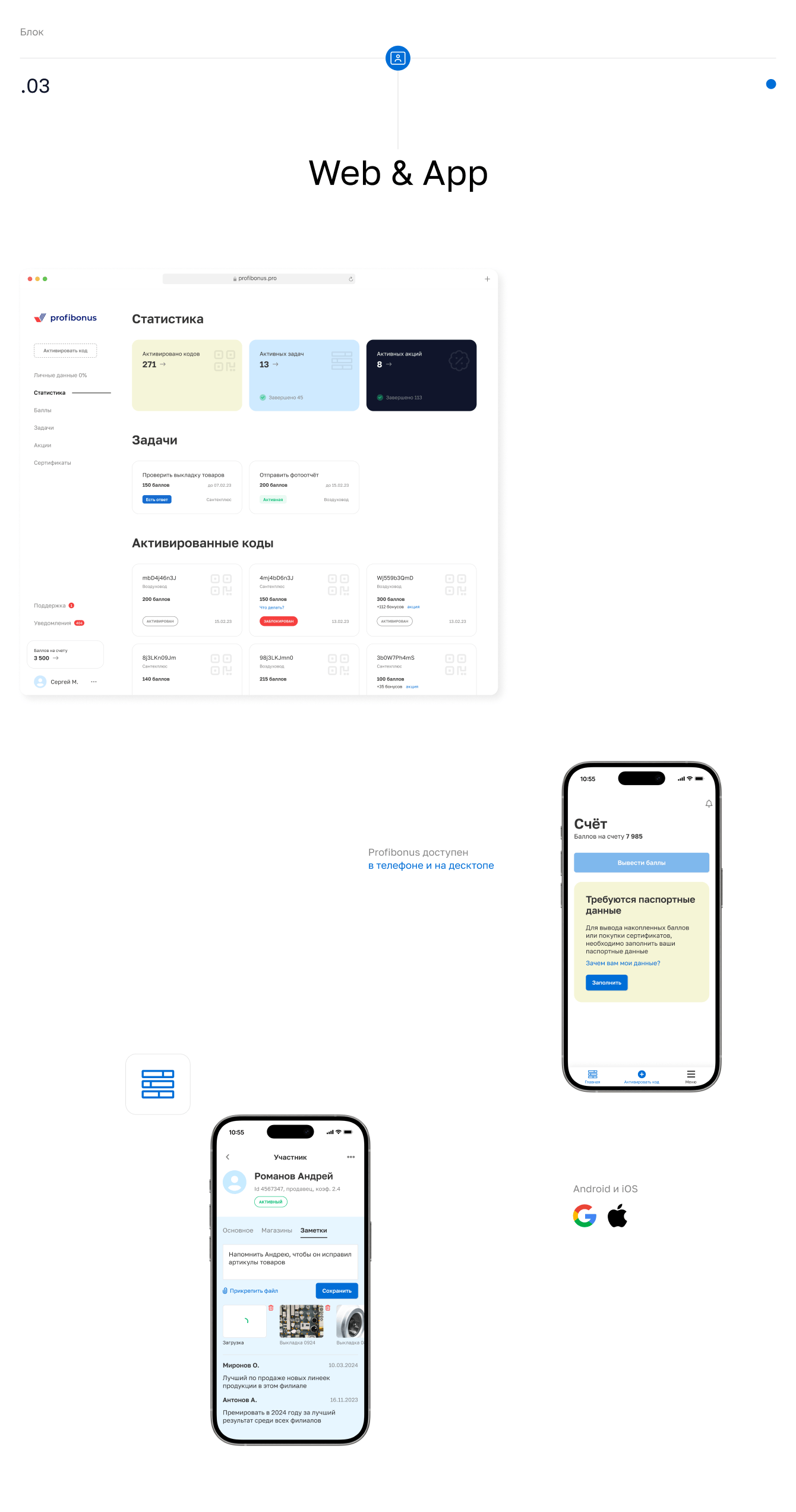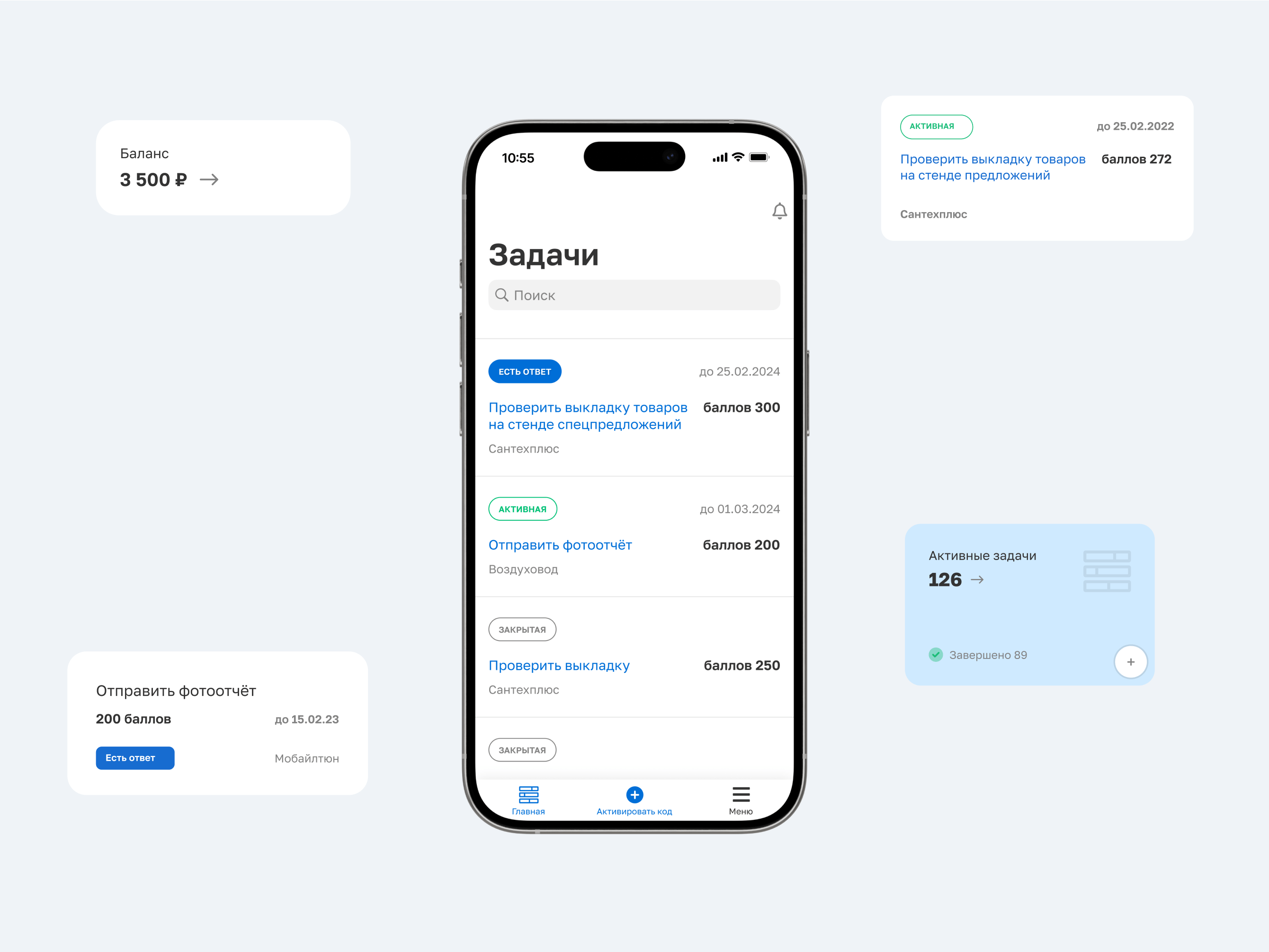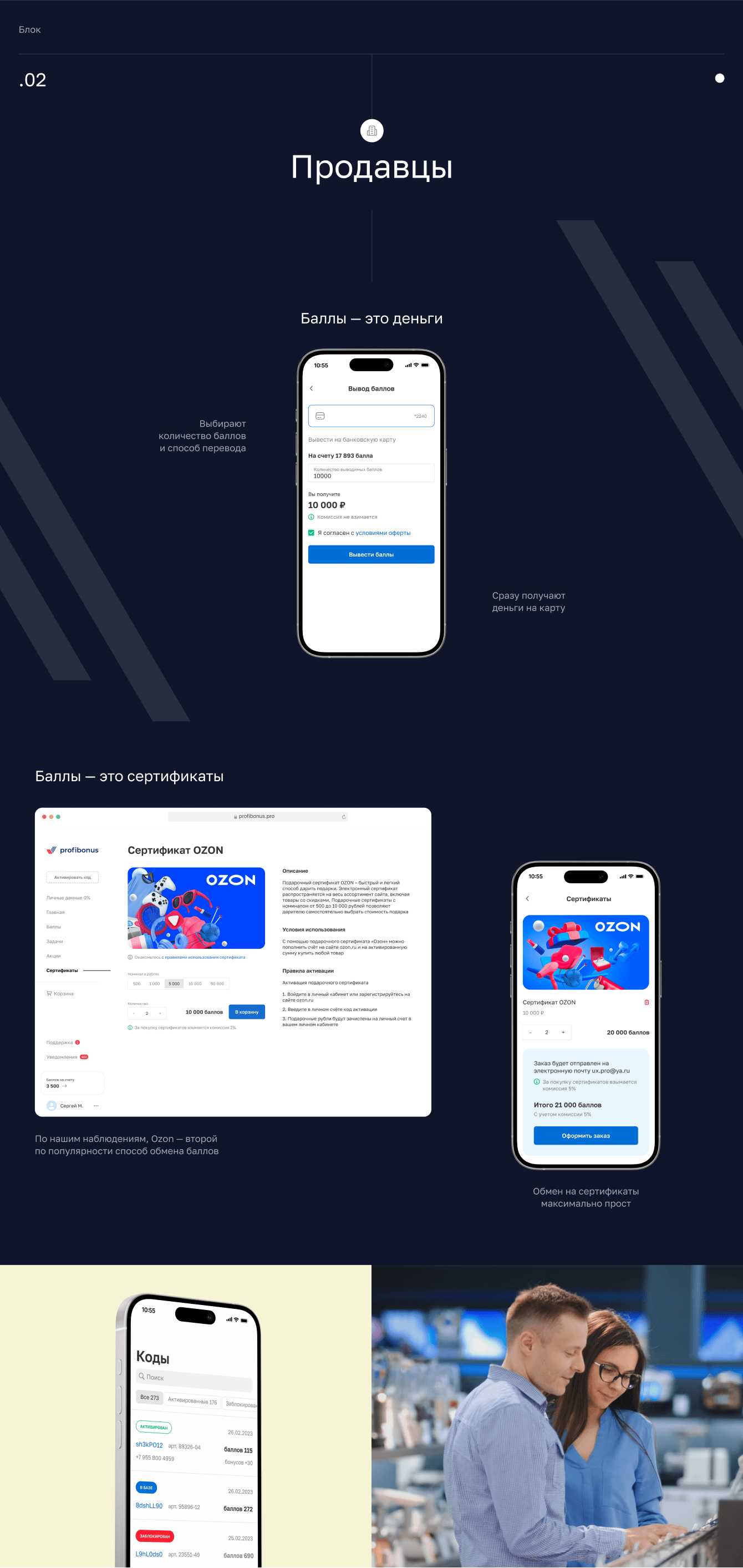 Сервис спроектирован так, чтобы продавцы могли легко активировать QR-коды, следить за акциями и выполнять задачи, зарабатывая бонусы и обменивая их на деньги или сертификаты
