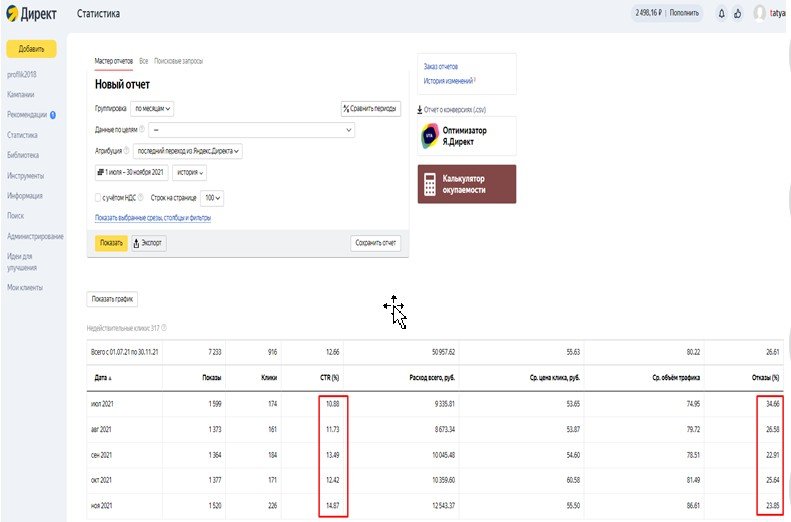 Из таблицы ниже видно, как поднялся CTR и снизился % отказов. При меньшем числе показов, увеличилось число кликов и возросли конверсии, которые стали стоить меньше.