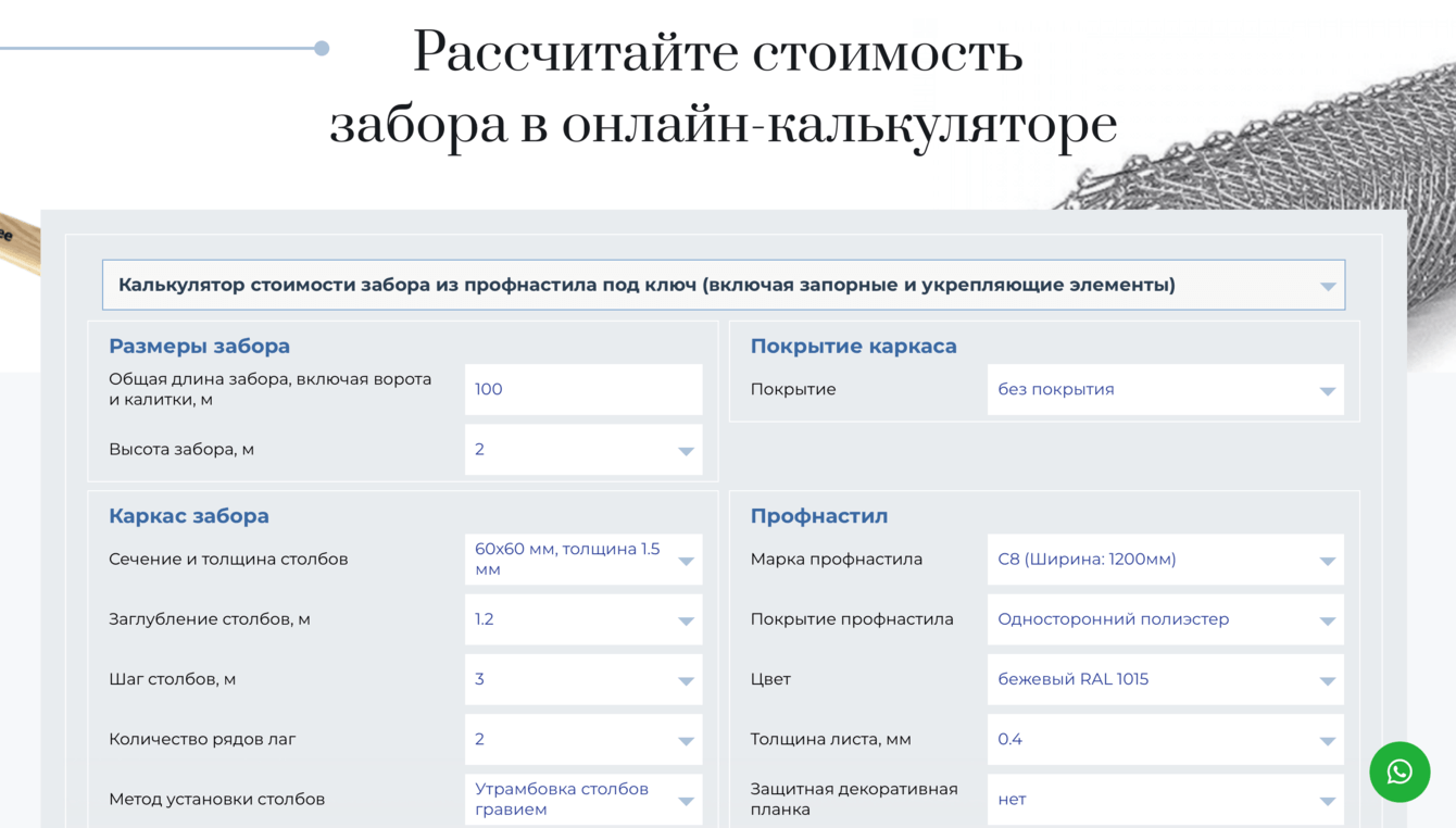 Разработали удобные калькуляторы — где клиент может подобрать наиболее выгодный для него вид/формат забора или ворот