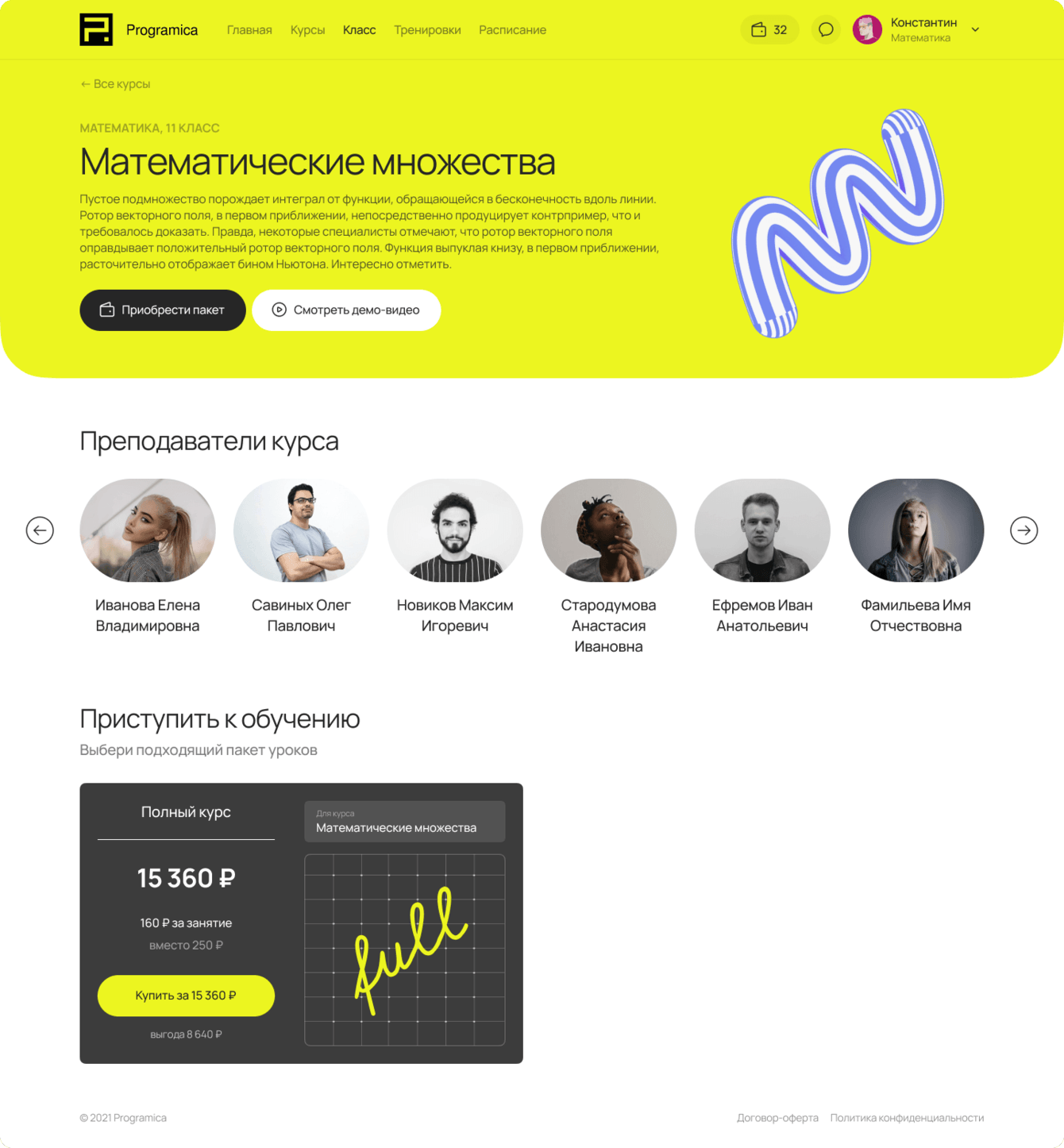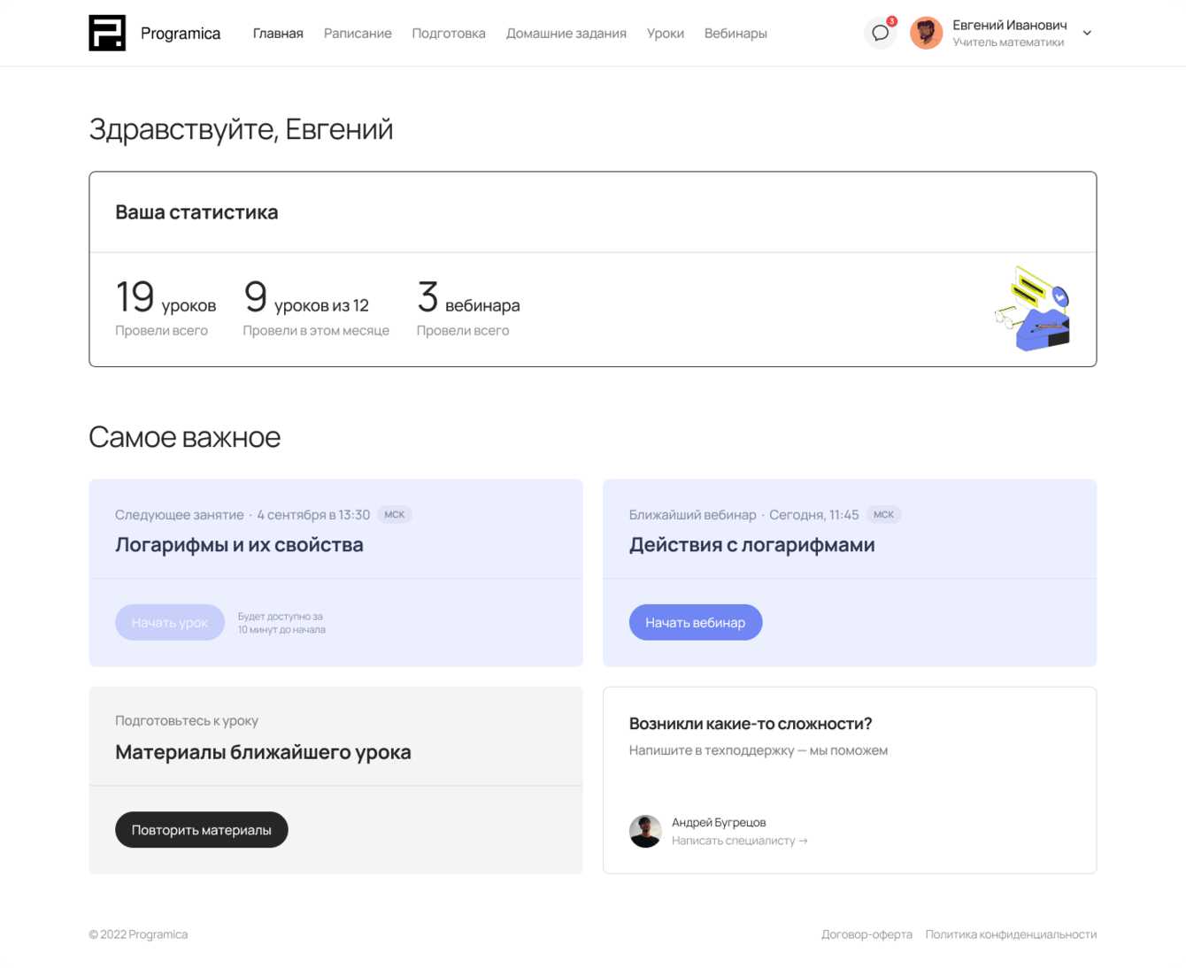 После оплаты ученику становится доступен раздел «Класс»: на главной странице раздела выводится статистика по выполненным ДЗ, пройденным урокам и тренировкам, расписание, ссылка на ближайший урок, доступны записи прошедших уроков и другое.