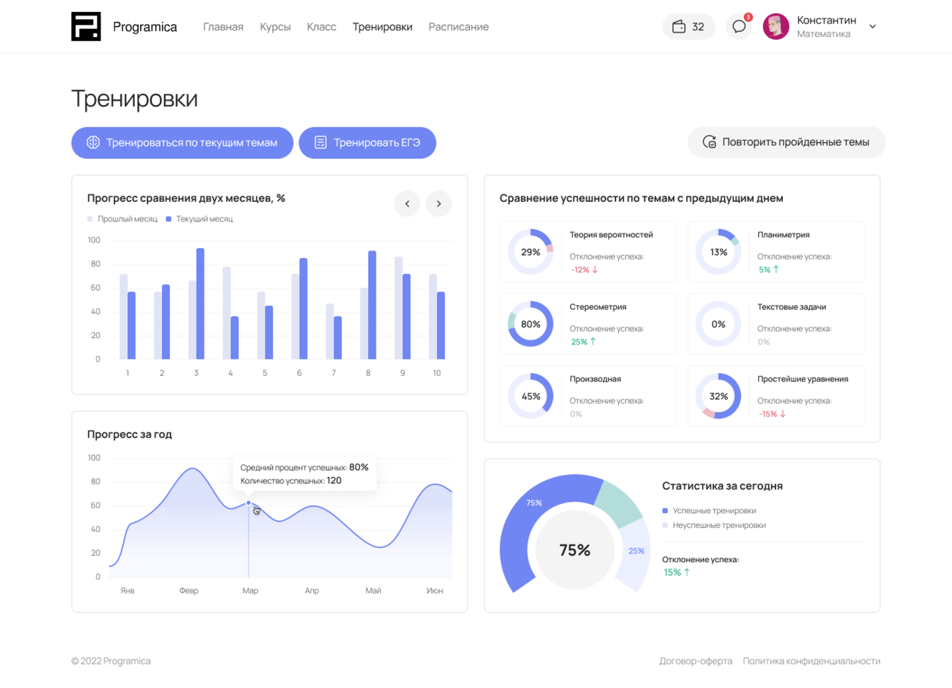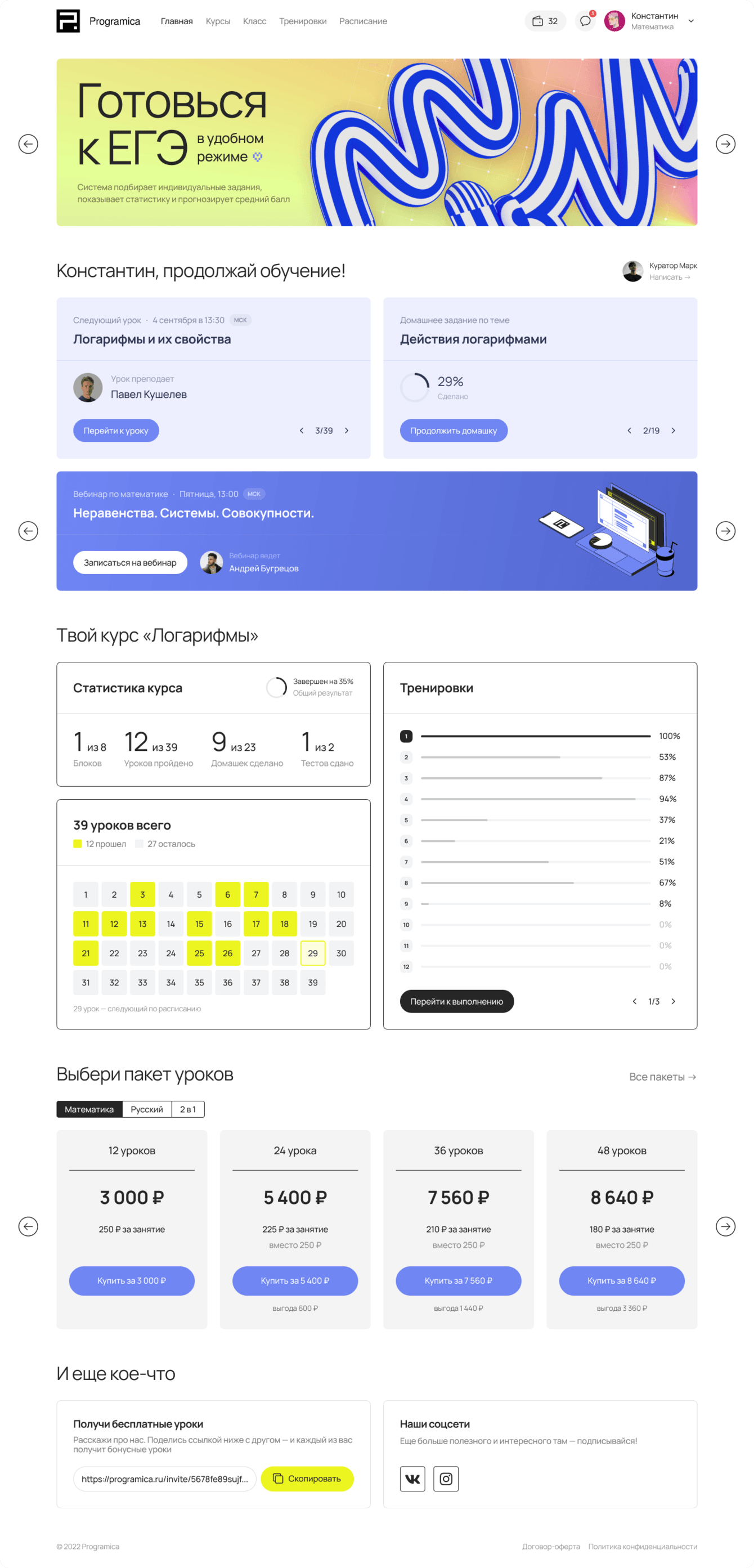 После оплаты ученику становится доступен раздел «Класс»: на главной странице раздела выводится статистика по выполненным ДЗ, пройденным урокам и тренировкам, расписание, ссылка на ближайший урок, доступны записи прошедших уроков и другое.