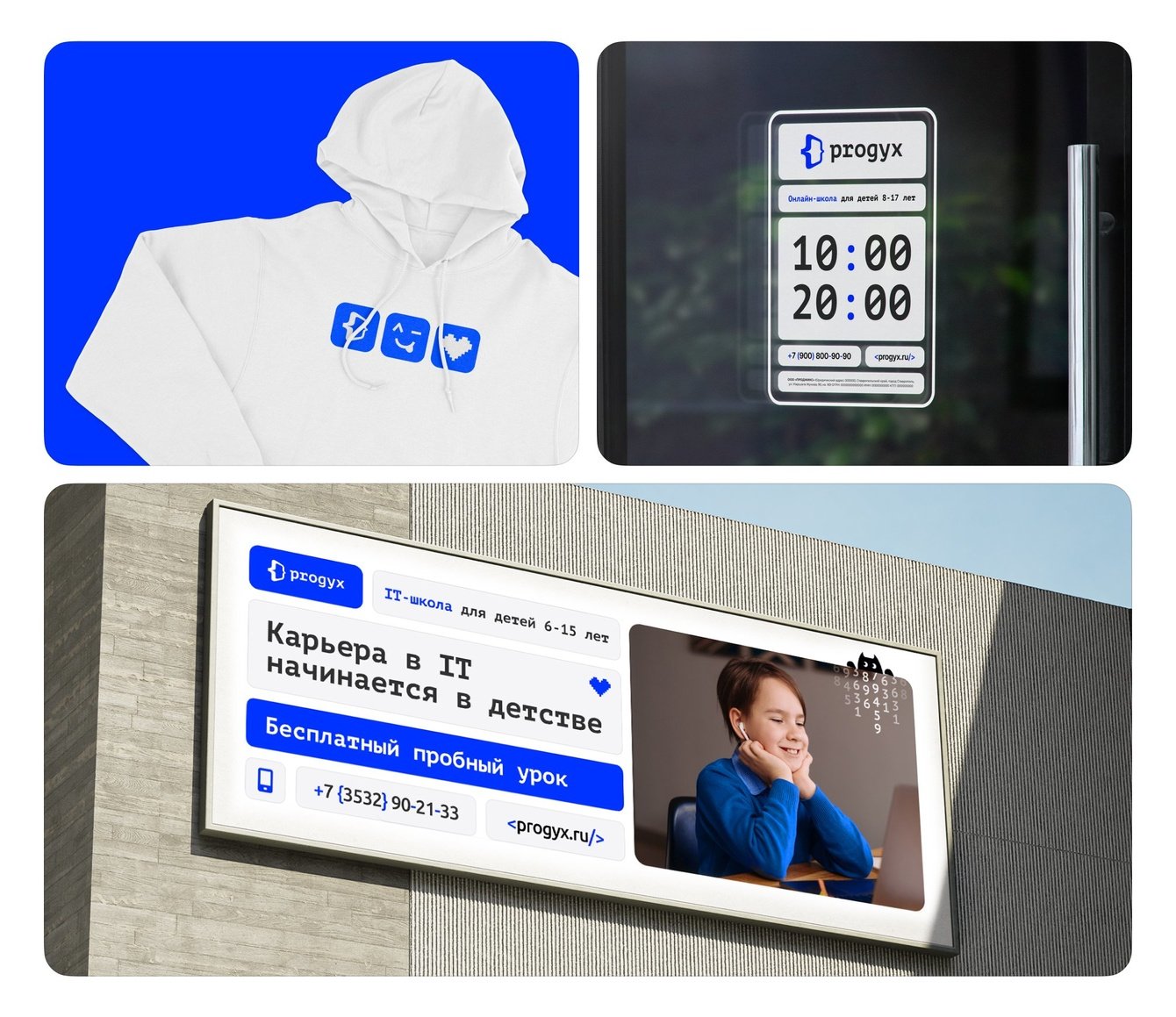Простота фирменного знака в сочетании с его асимметричностью позволяют логотипу «зацепить» внимание наблюдателя, а отсутствие ярких и избыточно «детских» деталей позволило поддержать сквозную идею бренда: {progyx} про образование, а не про развлечения.