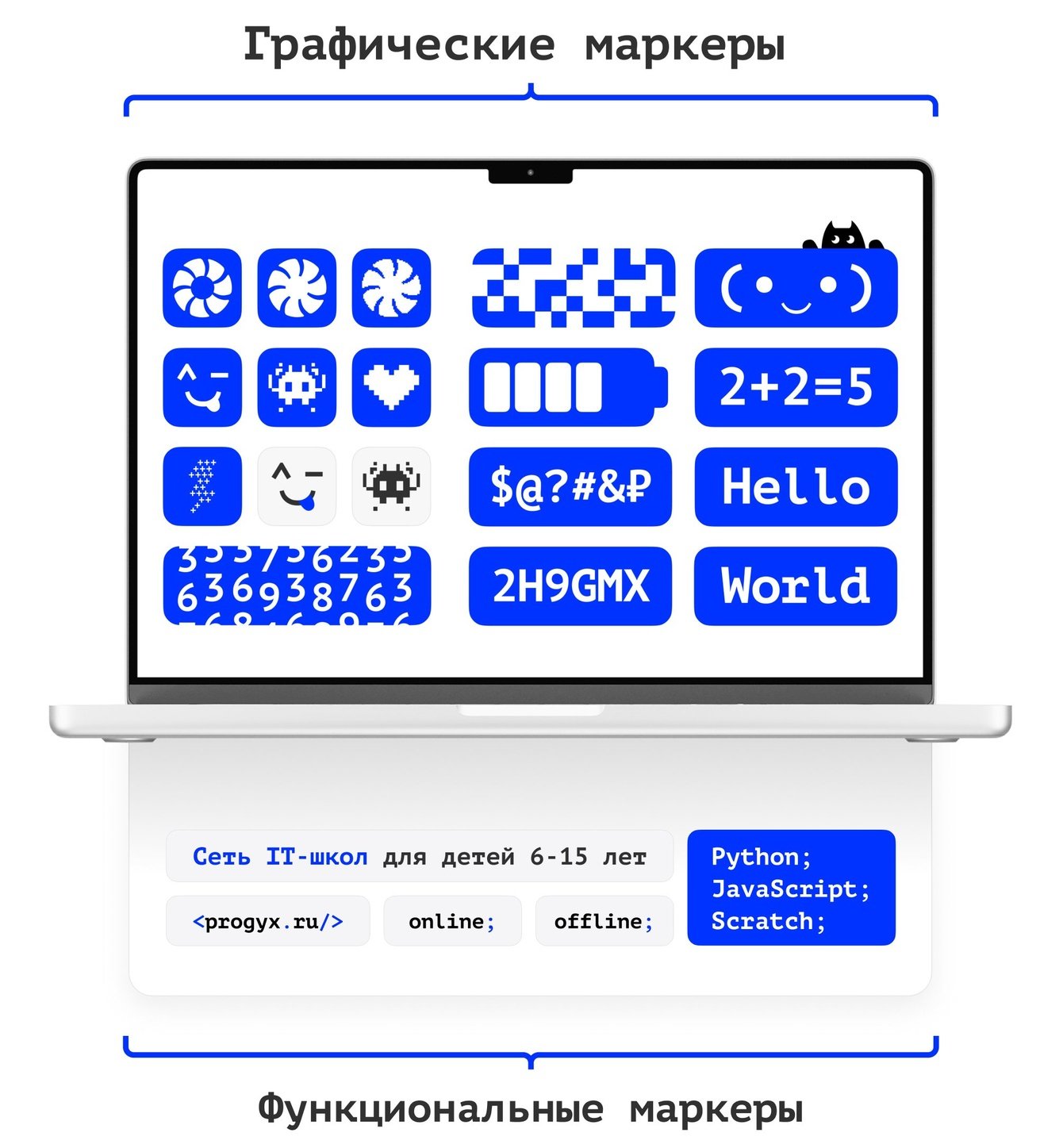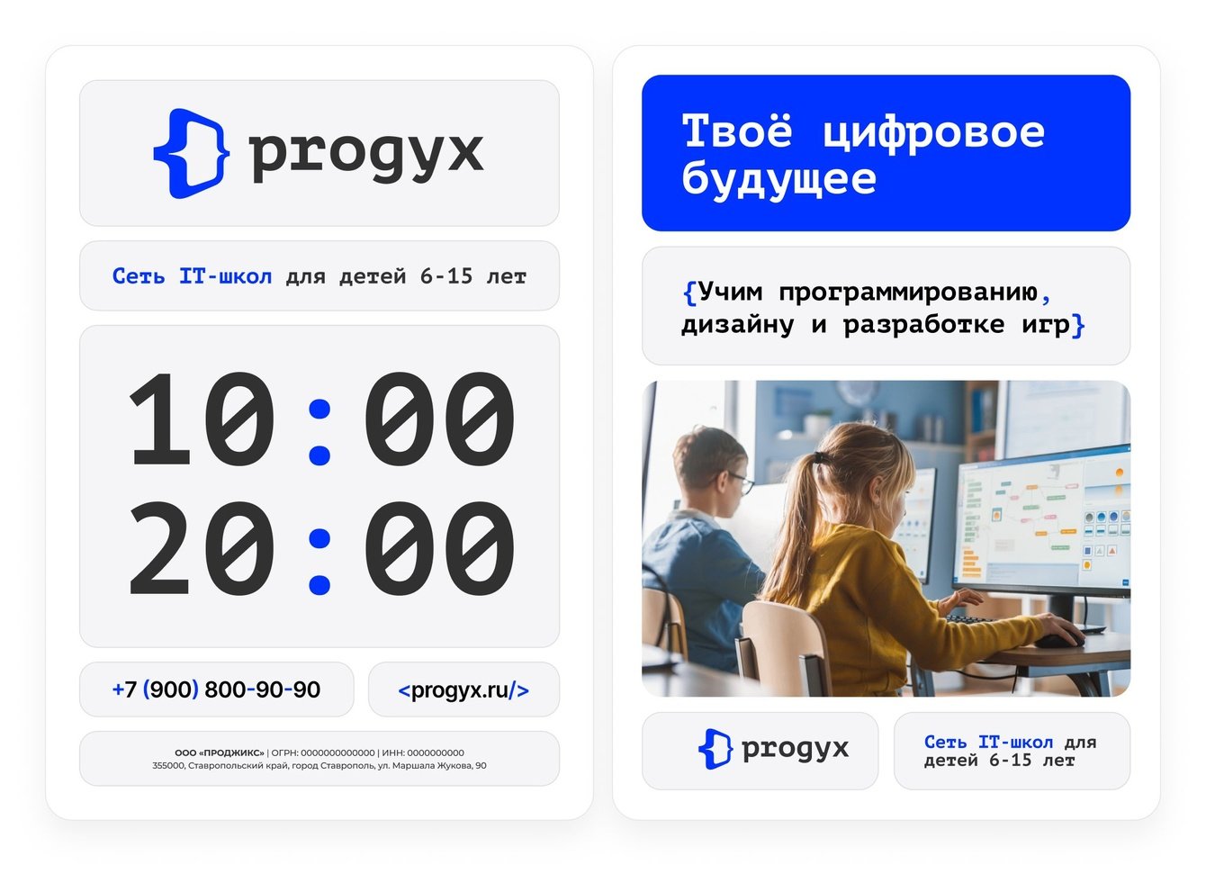 Несмотря на сдержанный характер бренда, {progyx} — все же детская школа программирования, поэтому разбавить айдентику чем-то озорным и веселым было просто необходимо.