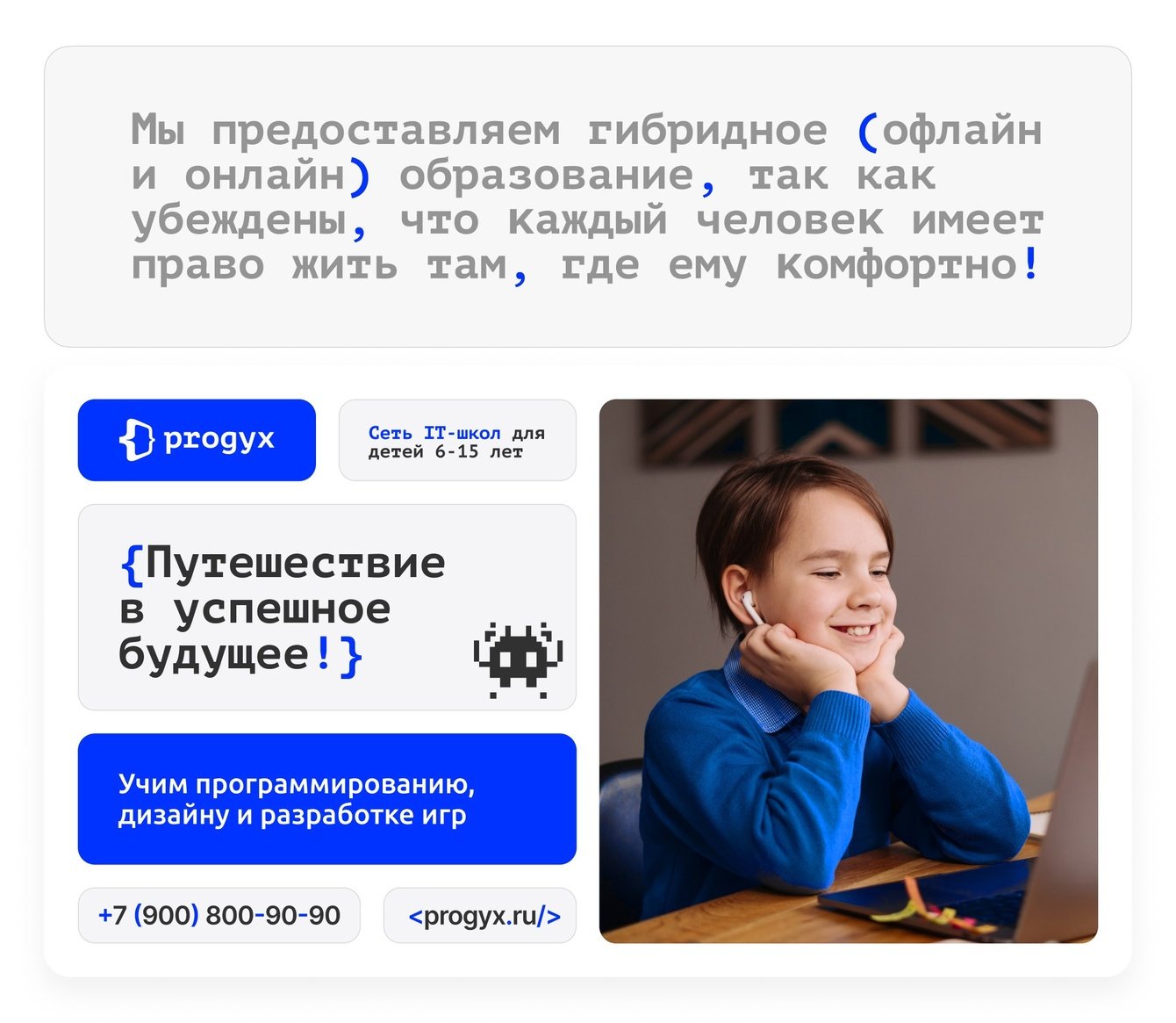 Цветовая схема и бенто-дизайн макетов подкупают своей простотой и необычностью, а система маркеров позволяет увлечь не только детей, но и родителей — потенциальных клиентов {progyx}. Нам удалось отразить игру в образовательном подходе клиента, сохранив при этом утилитарность дизайна: синие акценты встречают клиента на входной табличке и не отпускают вплоть до табелей успеваемости его ребенка.