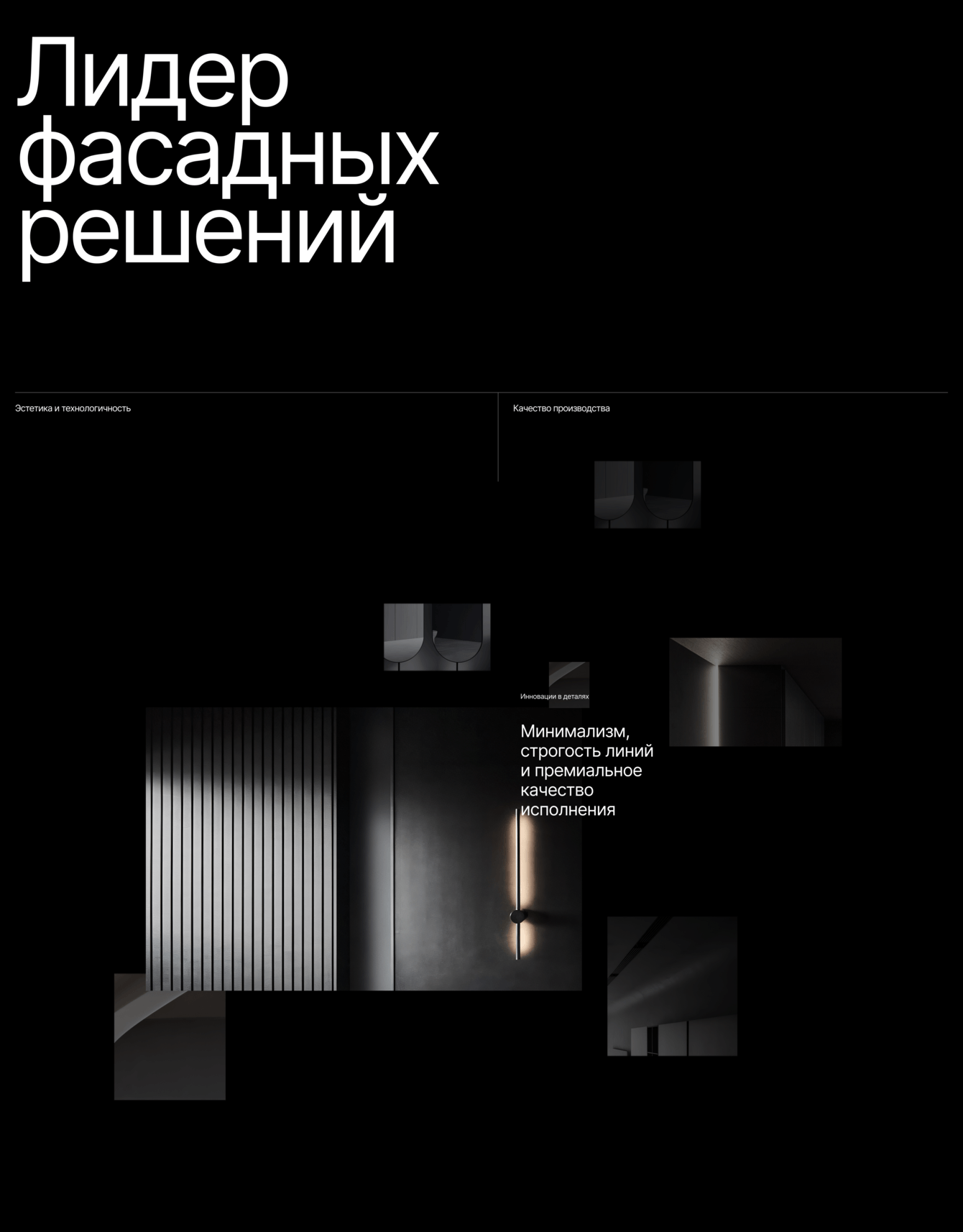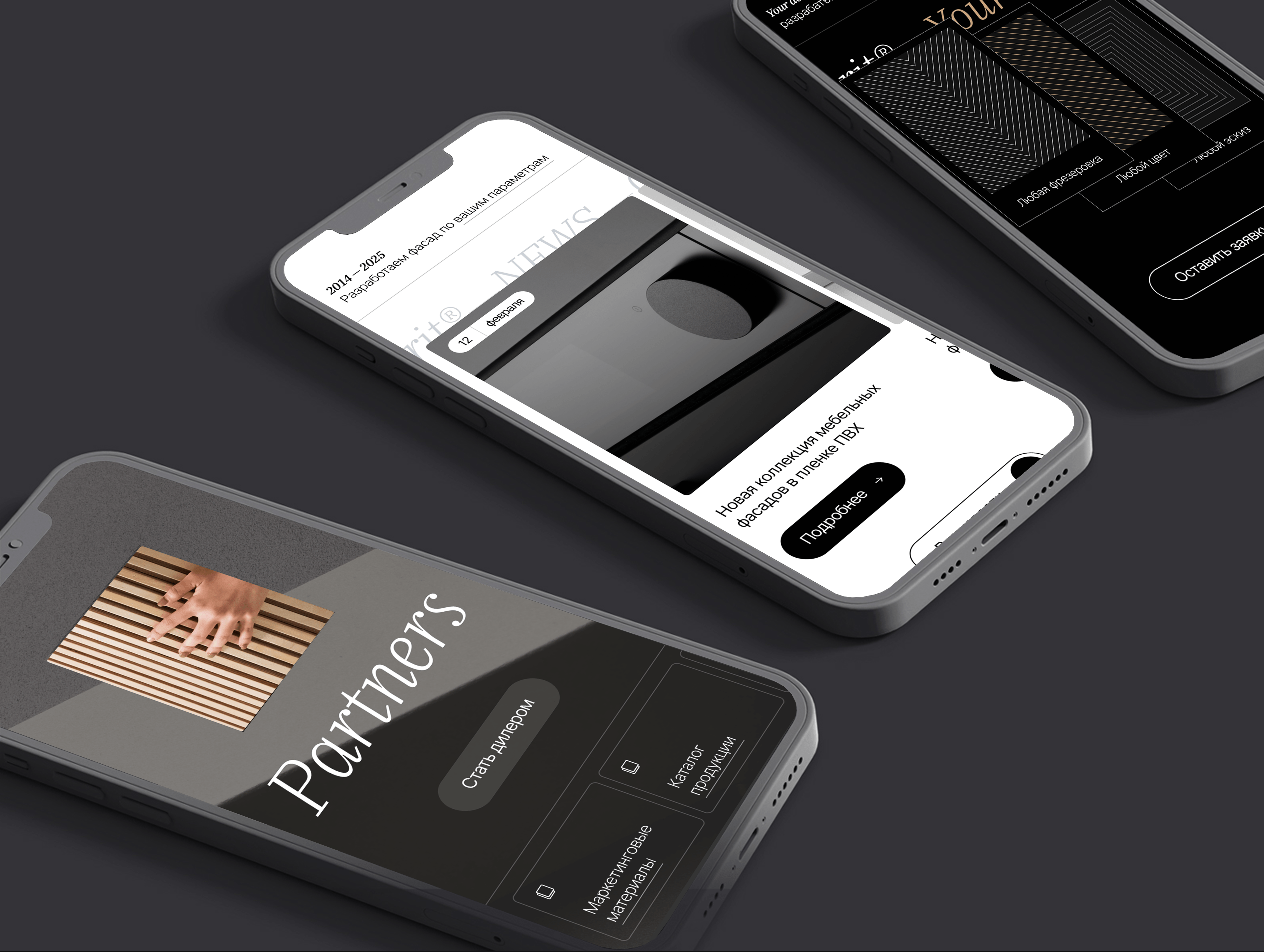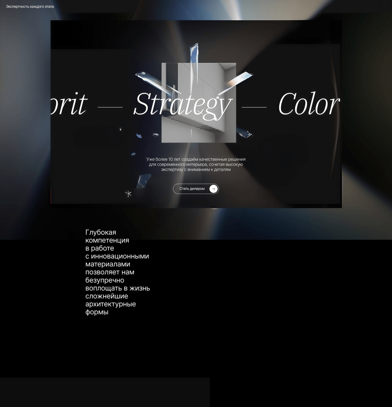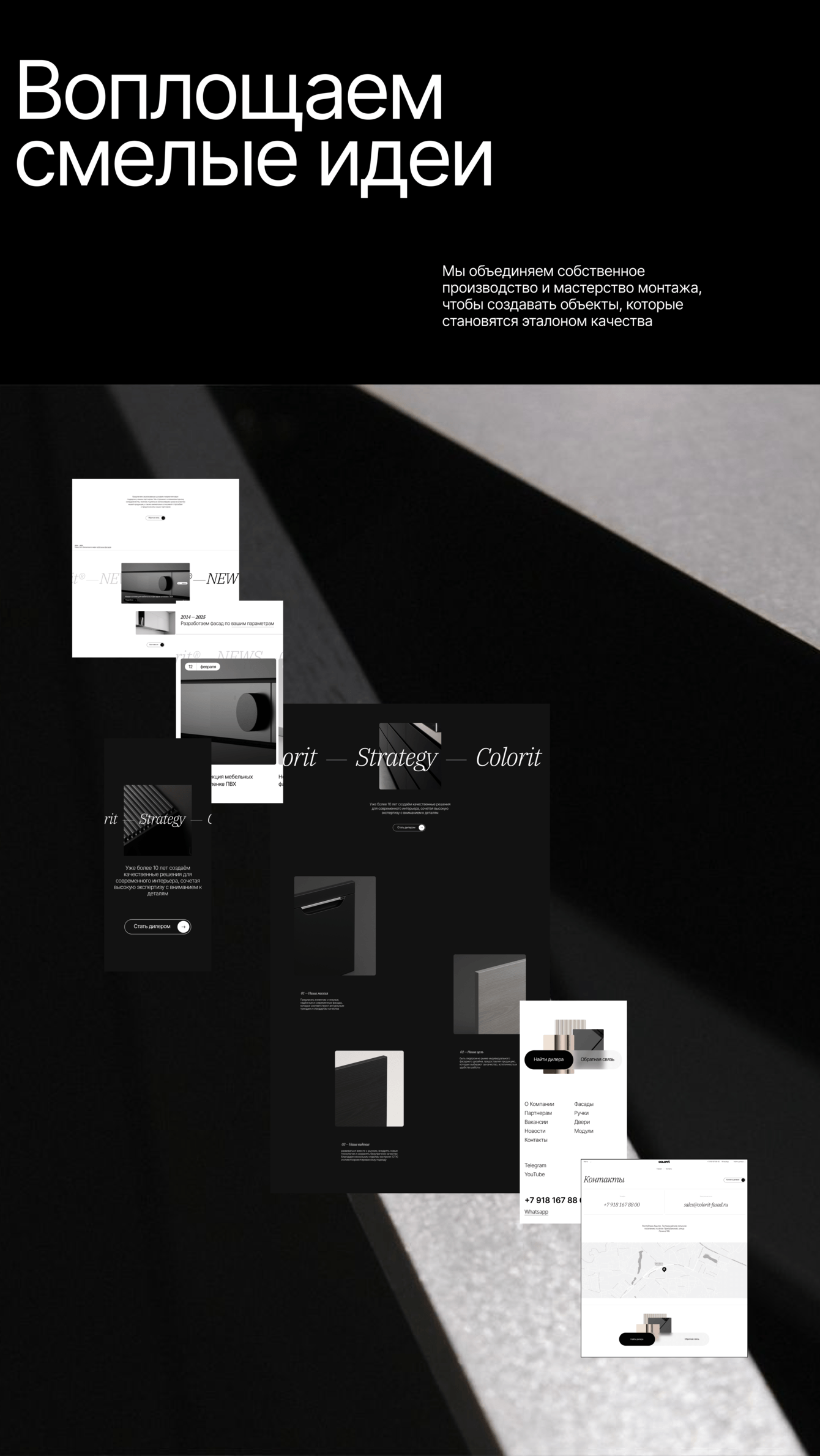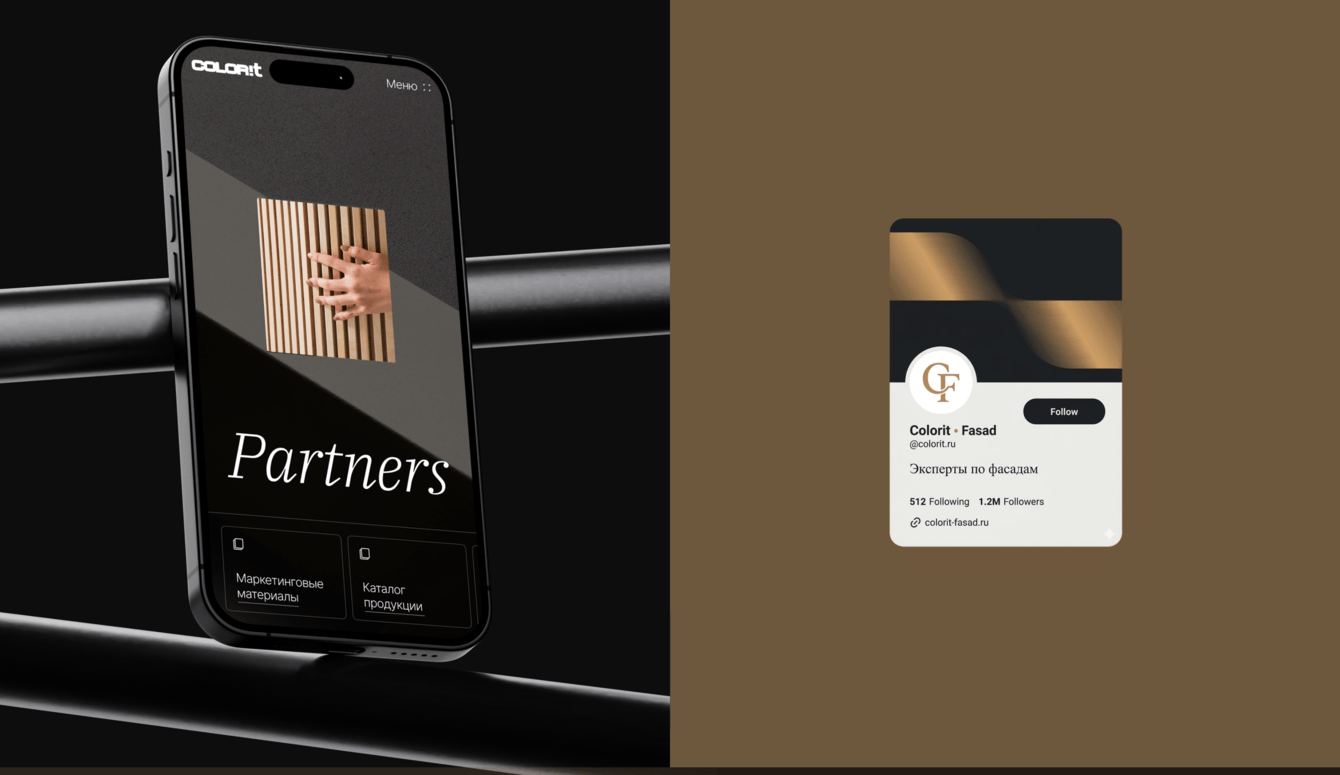 Это главная страница и разделы «О компании» и «Партнеры». Мы хотели, чтобы первый взгляд на сайт сразу создавал ощущение премиального бренда: темные насыщенные тона, крупные графические элементы, анимации при скролле. Всё, от типографики до деталей интерфейса, подчеркивает, что «Колорит» — это европейский уровень, где продукт выглядит стильно и дорого.