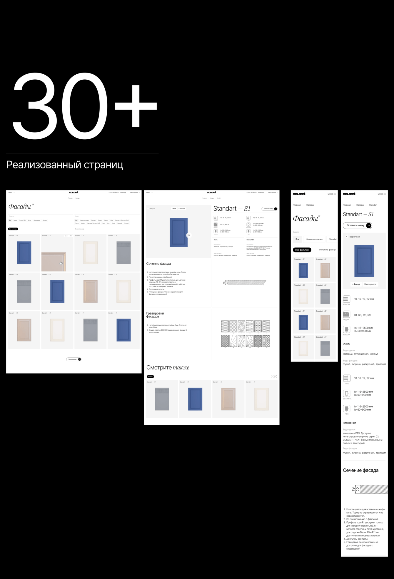 Каталог продукции — это рабочий инструмент. Светлый фон, удобные фильтры, визуальные подсказки, таблицы и чертежи позволяют быстро подобрать фасады, двери и модули по размеру, цвету, отделке и другим параметрам. Мы сделали так, чтобы техническая информация не пугала и не перегружала пользователя, а помогала ему принимать решение.