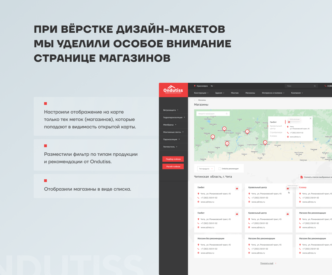 Для реализации такой логики было решено отслеживать координаты видимой части (границ) карты и передавать их в запросе, чтобы получить актуальный список магазинов и их корректное отображение. Без внимания не остались и всплывающие подсказки (тултипы). Они были нужны на всех текстовых страницах, чтобы пояснять содержание терминов.
