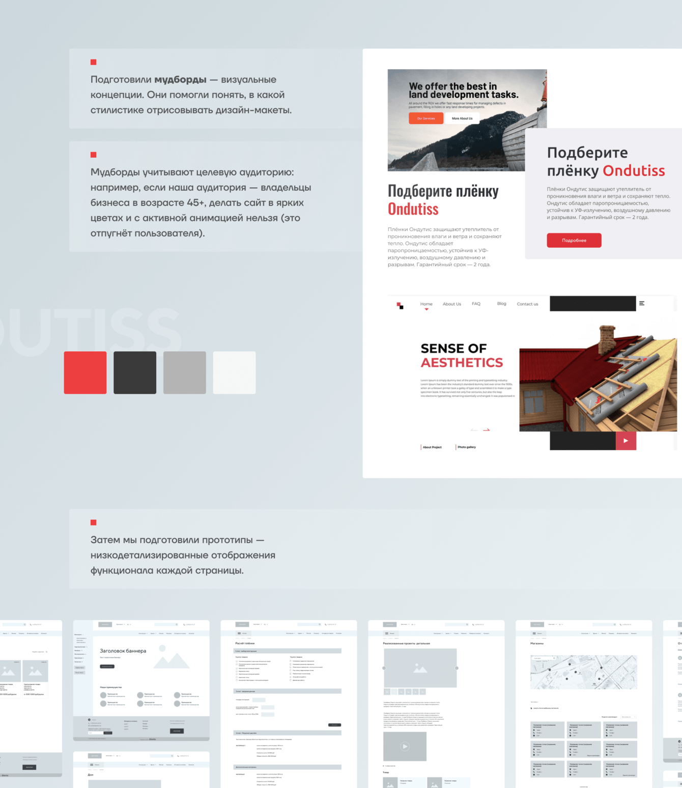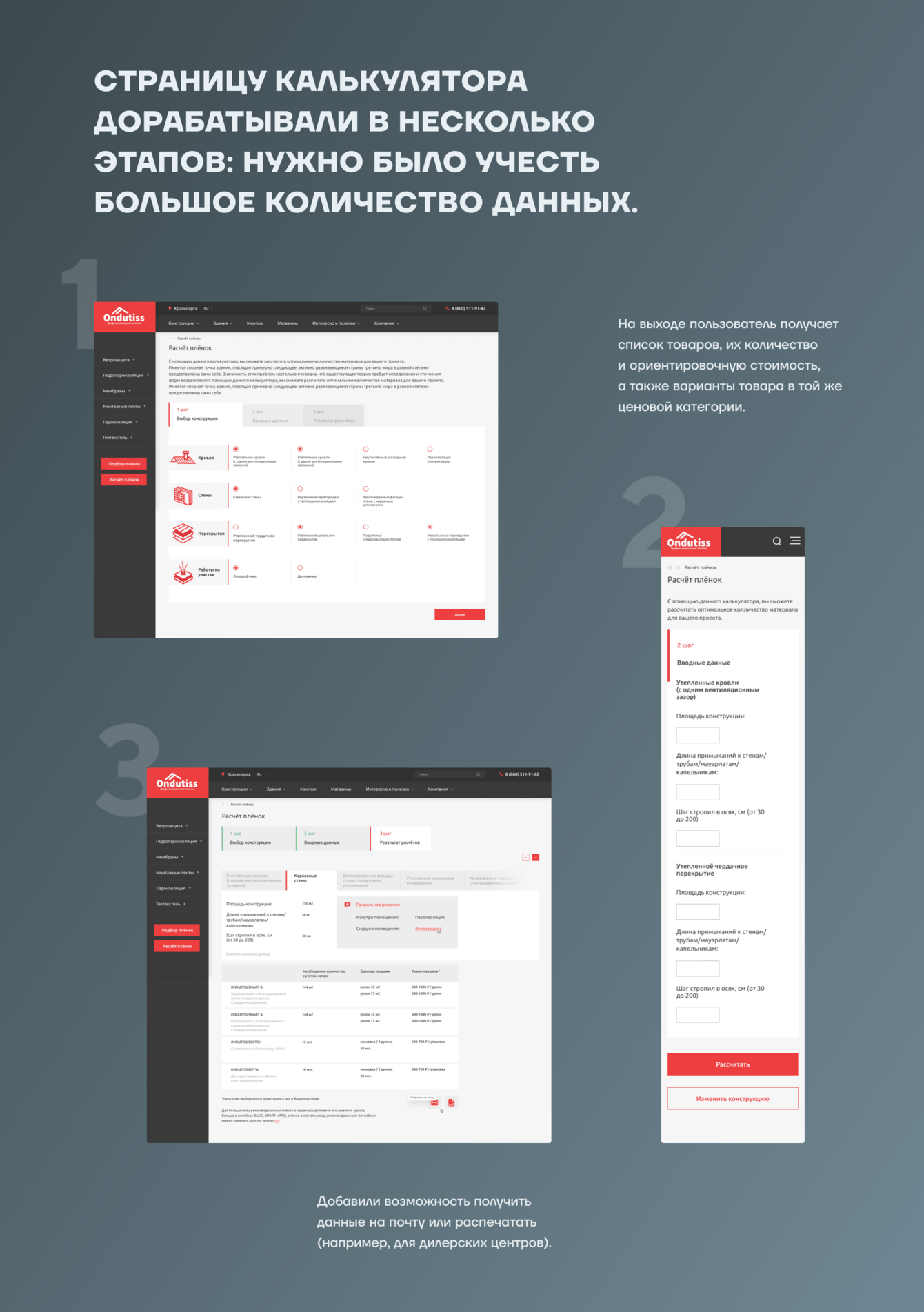 Создали информационную страницу пошагового подбора плёнки в зависимости от конструкции зданий и типа помещений. Это помогает пользователю ориентироваться в обширном ассортименте.