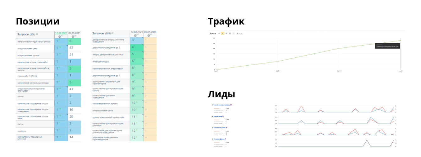 - Запросы: Через 2 месяца сайт оказался в ТОПе по ключевым запросам: «конические опоры», «кронштейн для прожектора» и «мачты уличного освещения».
