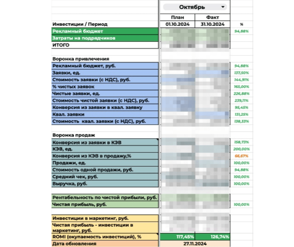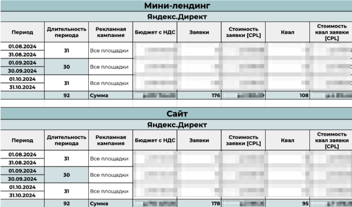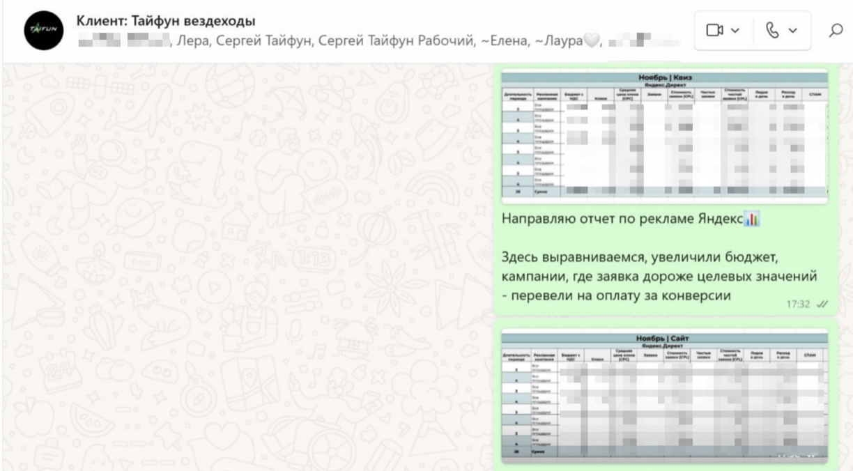 Также 2 раза в неделю мы предоставляем отчетность клиенту по основным показателям: потраченный бюджет, стоимость уникально-целевой заявки, смотрим динамику по квалам, КЭВам и продажам через аналитику.