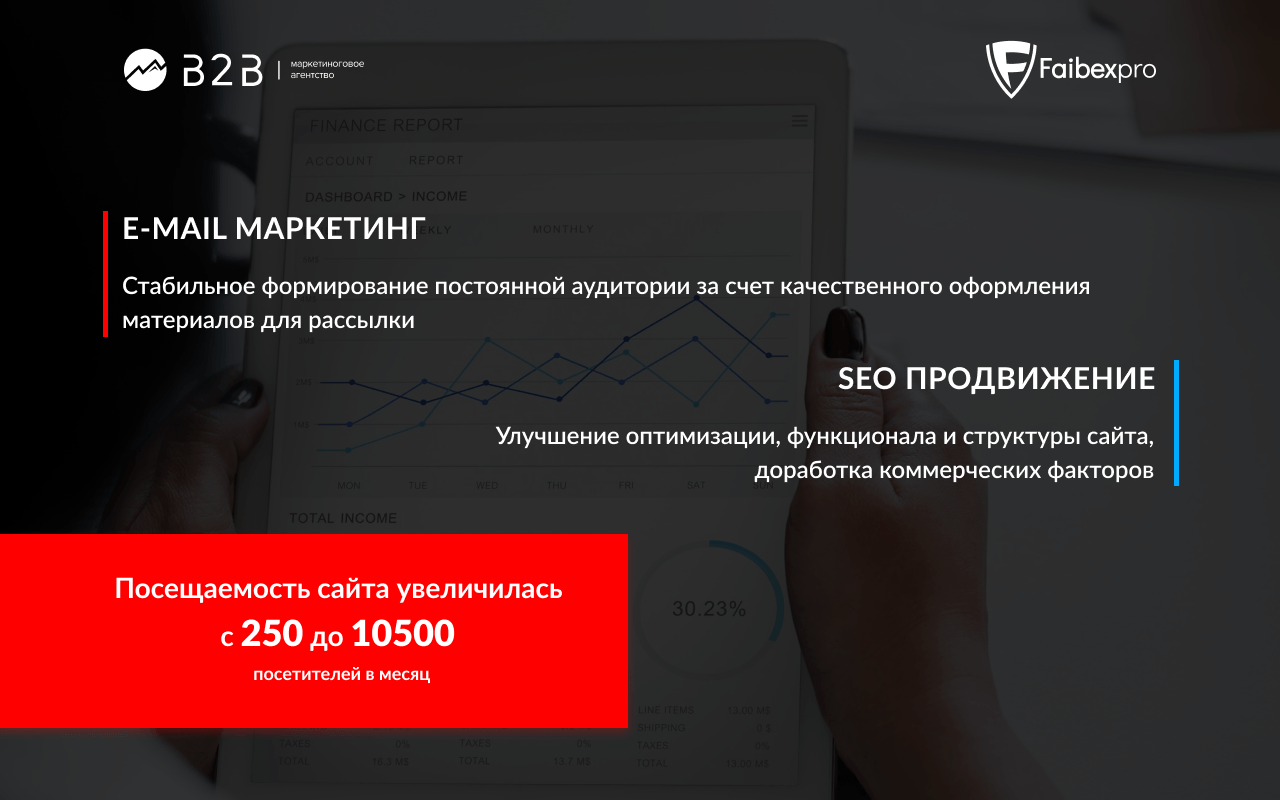 Вывод в топ по Москве всех карточек товара. Была проведена большая работа по улучшению оптимизации, функционалу и структуры сайта. Были доработаны коммерческие факторы. В результате примененных действий посещаемость сайта увеличилась с 50 до 10500 посетителей в месяц. И это при ограниченном бюджете.