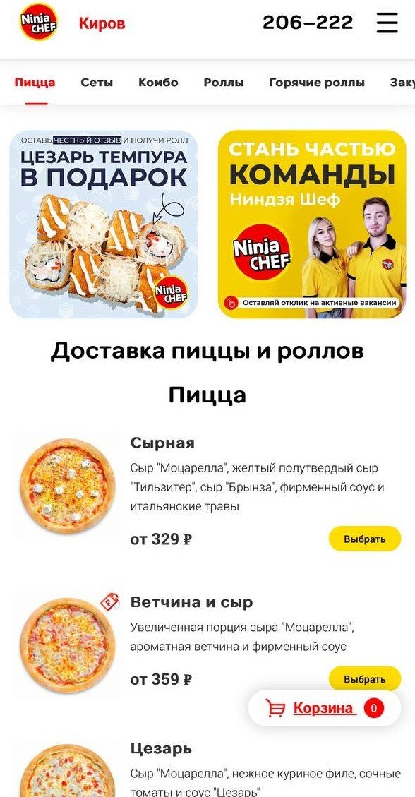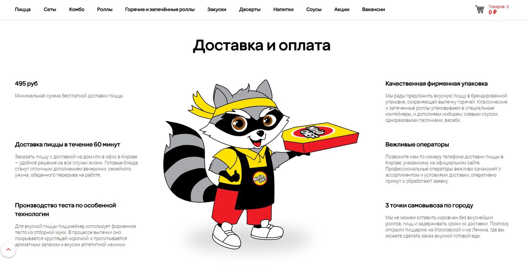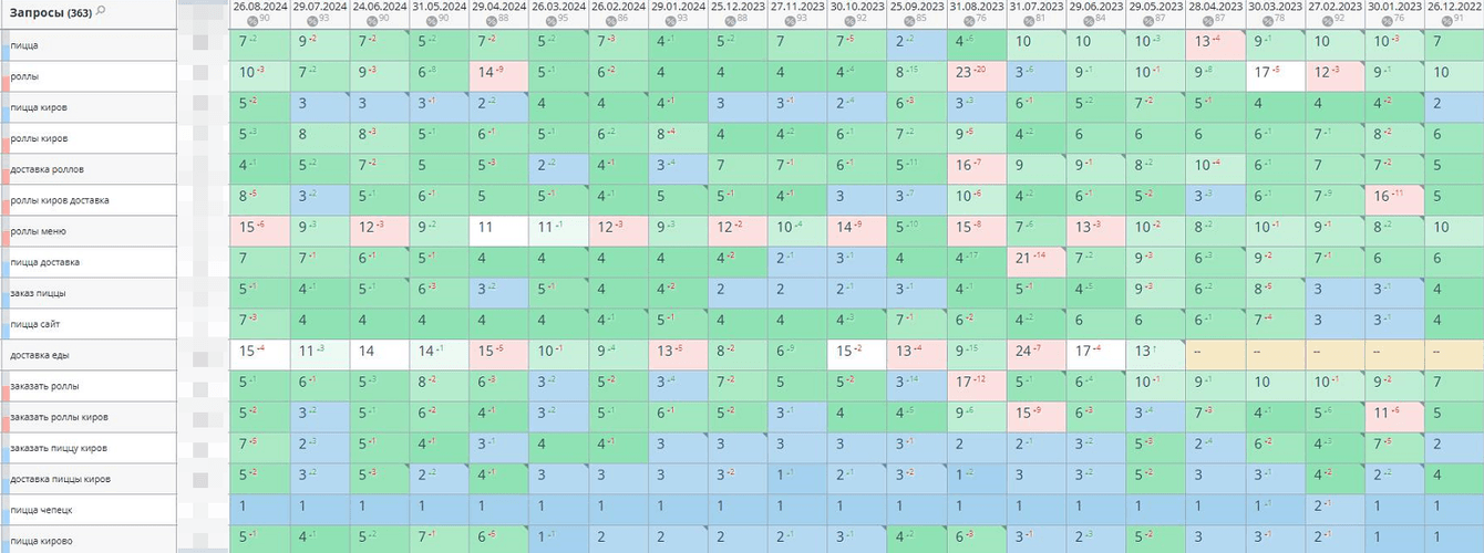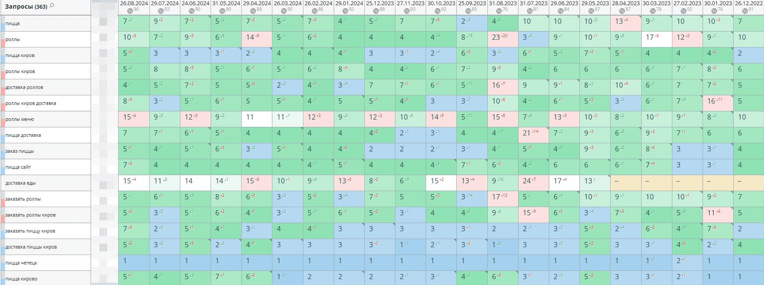 Расширение семантического ядра: Собрали полное ядро запросов, охватывающее все основные направления по доставке еды. Включены не только общие запросы, как «доставка пиццы Киров», но и конкретные запросы на роллы, комбо-наборы и акционные предложения. Так сайт стал релевантен максимальному числу поисковых запросов.