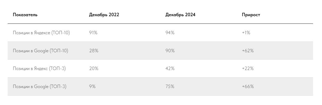 Результат: Благодаря проработанному семантическому ядру и качественному контенту сайт стал более релевантен поисковым запросам, что привело к увеличению органического трафика и росту позиций.