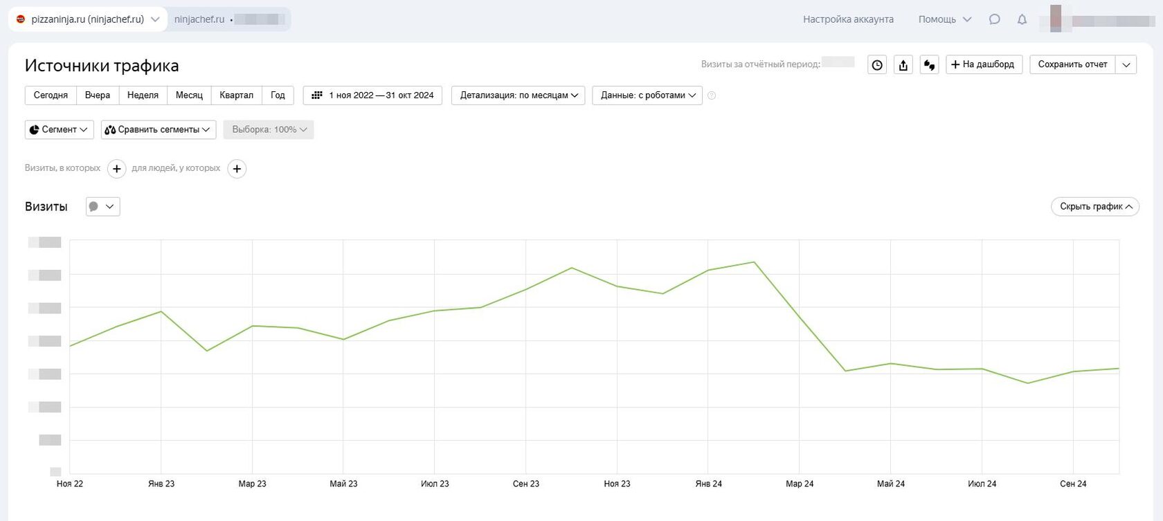Кроме этого, сложность была в том, что, перед тем как прийти к нам компания сменила название бренда и домена («Ниндзя Пицца» поменяли на «Ниндзя Шеф»). Это чревато потерей веса домена, проблемами с обратными ссылками, потерей трафика и замешательством пользователей.