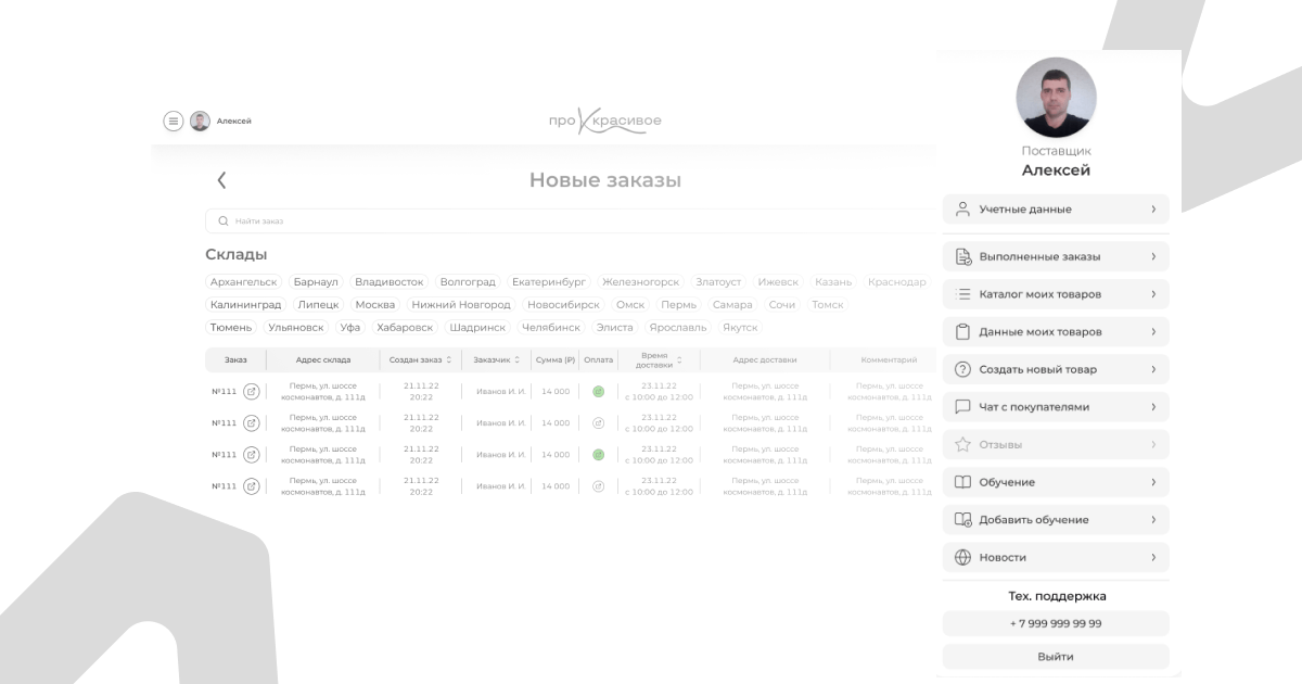 — Для поставщиков: аналитика, карточки товаров, заявки, фильтры по заказам.