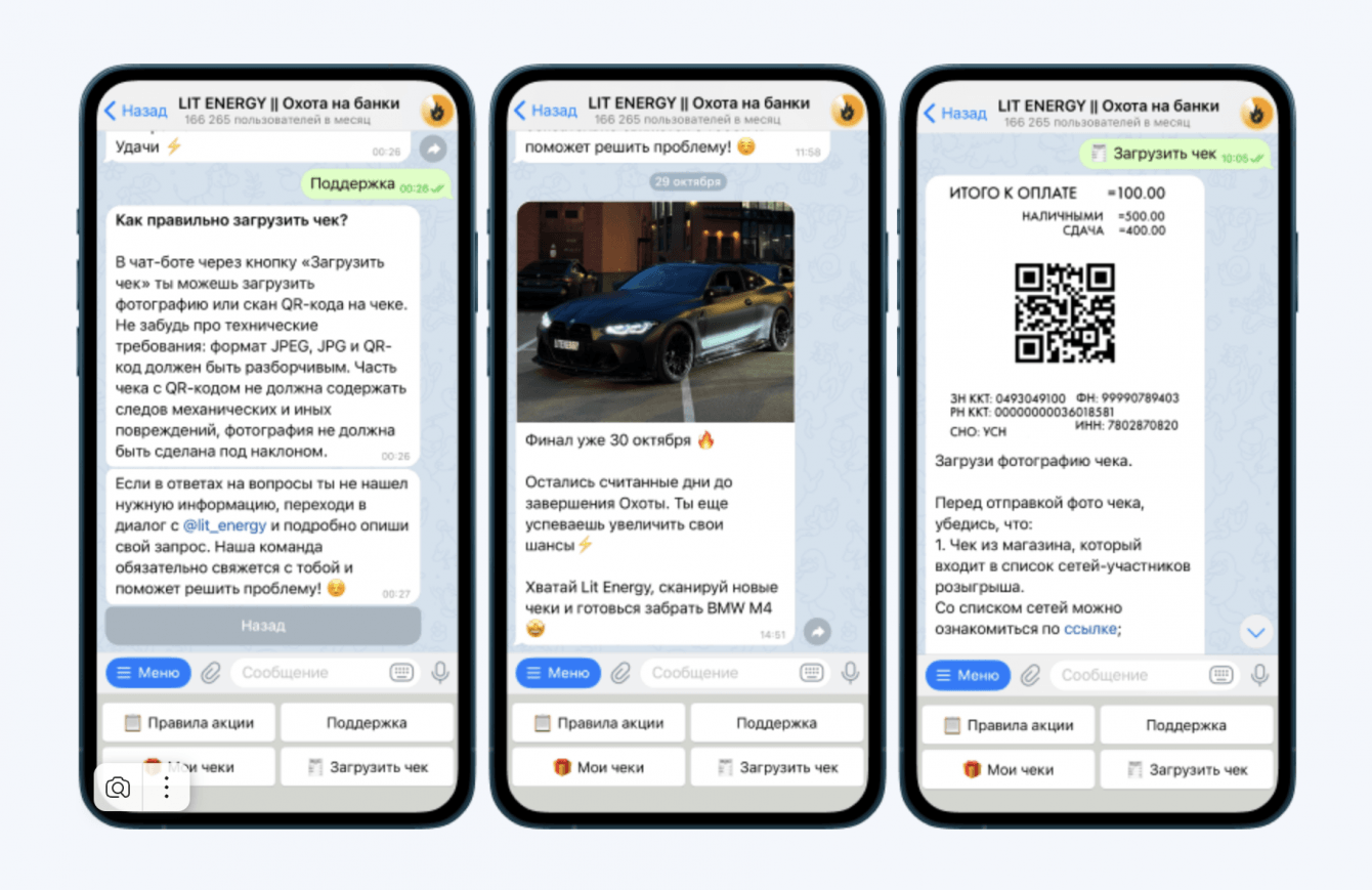 Чтобы зарегистрировать чек для участия в розыгрыше, пользователю необходимо отправить фотографию чека, а конкретно QR-кода на этом чеке. После получения фотографии чека, бот автоматически распознаёт QR-код и проверяет чек на соответствие условиям акции. После прохождения проверки система записывает пользователя в базу участников пропорционально количеству купленного товара.