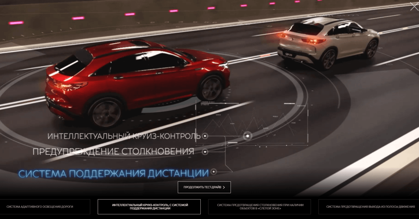 Разработать и реализовать дизайн и идею для модуля на официальном сайте и сайтах дилеров INFINITI: клиент может пройти тест-драйв автомобиля INFINITI QX55 с помощью своего устройства.