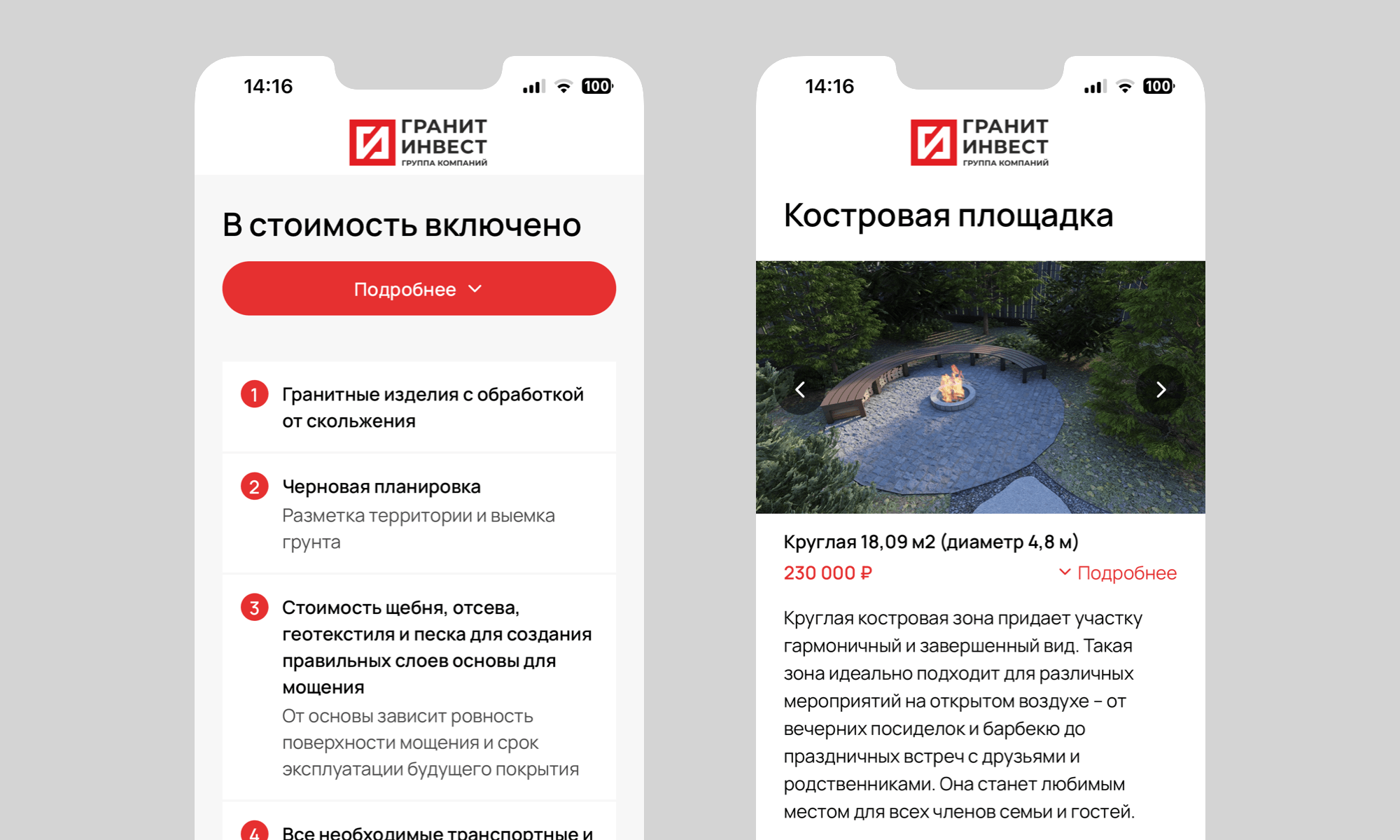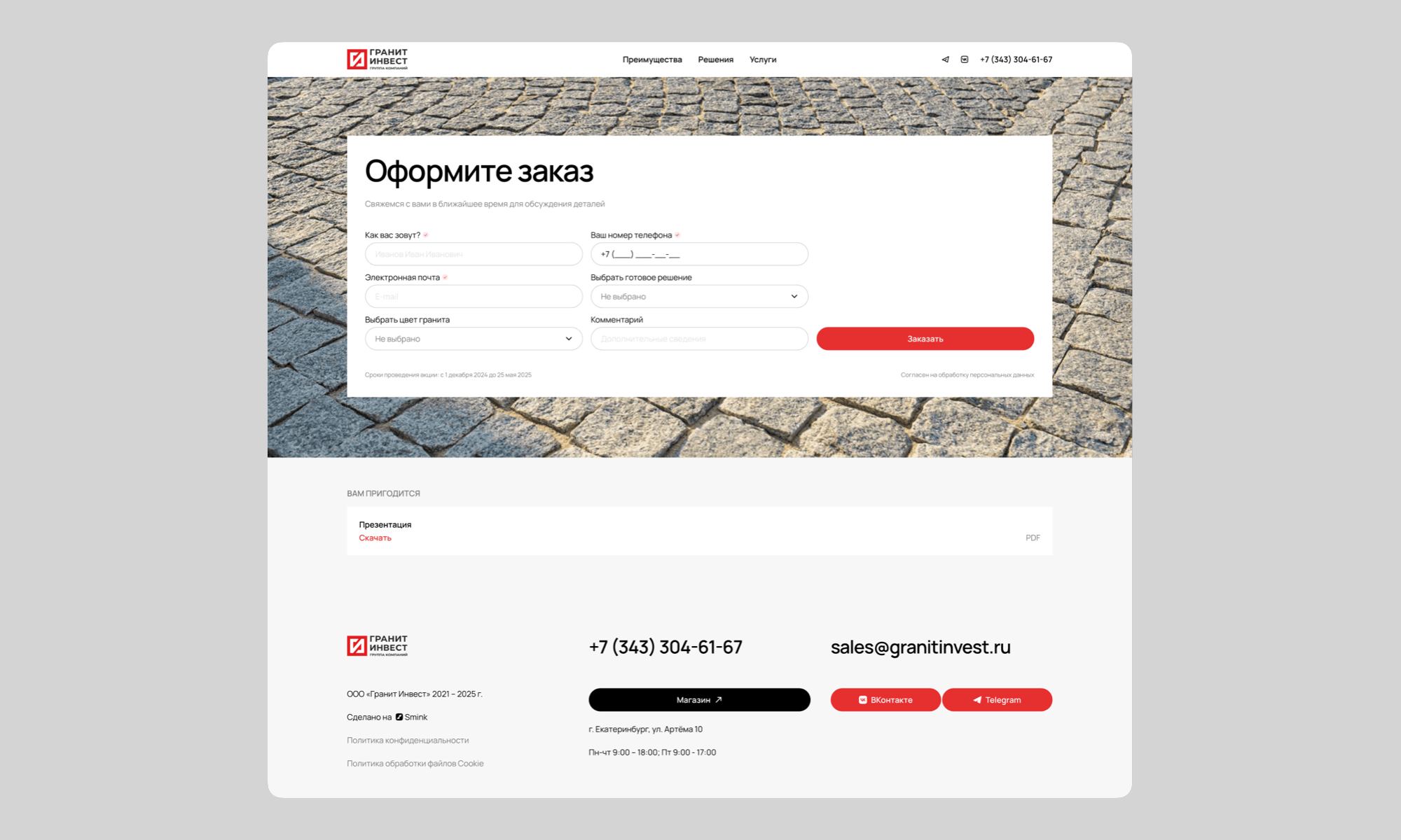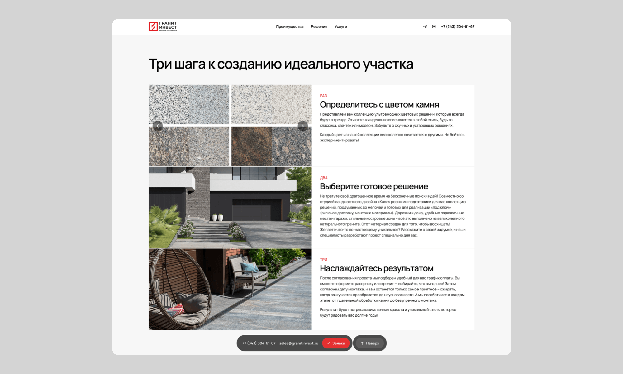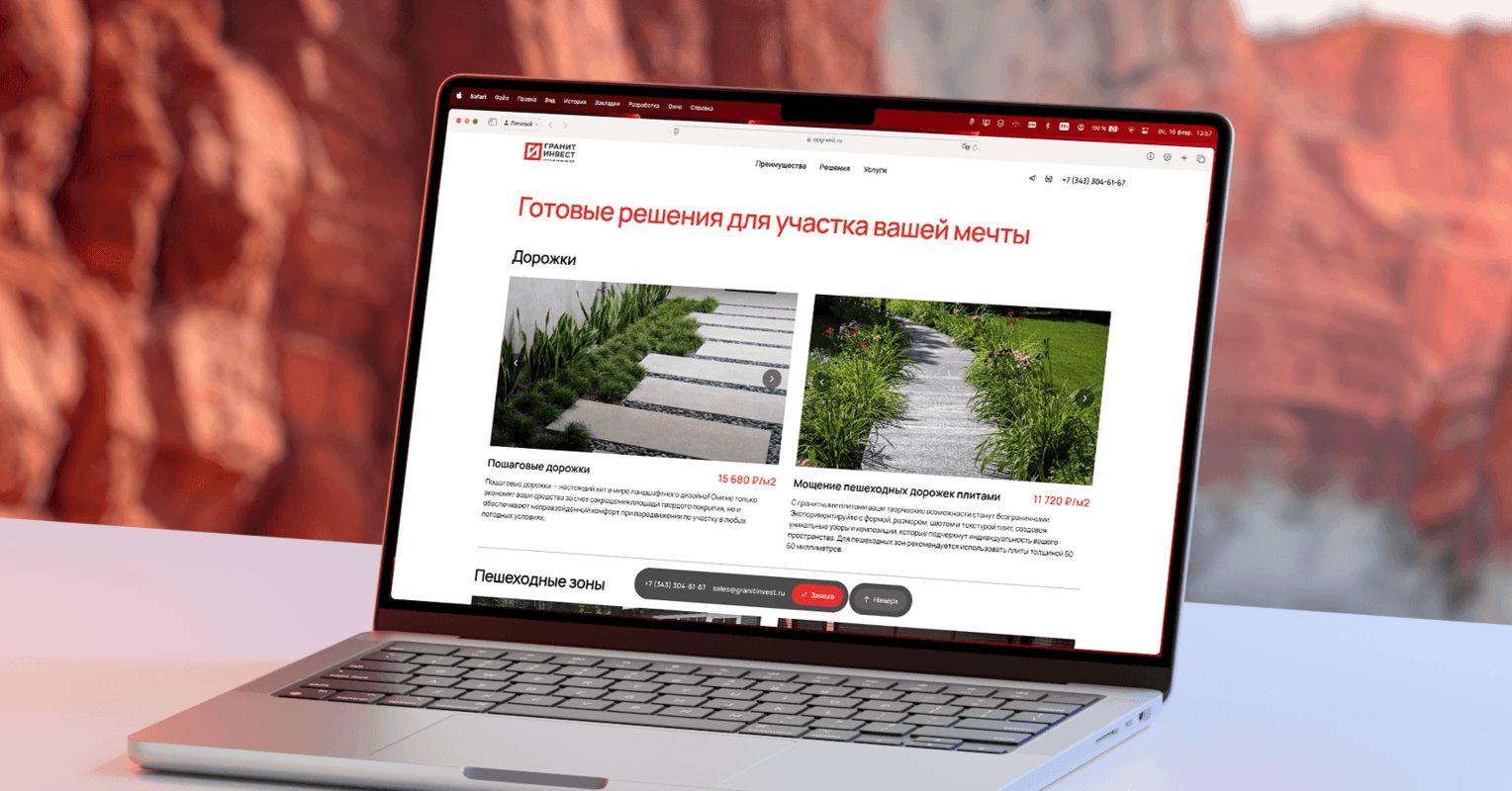 Проект был ориентирован на создание лендинга, который будет служить эффективным инструментом для привлечения клиентов, заинтересованных в закупке гранитной плитки для благоустройства территорий. Основной задачей было разработать сайт, который быстро и понятно донесет до посетителей информацию о продукции, услугах компании и их преимуществах.