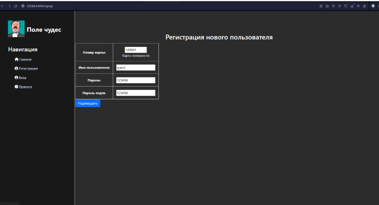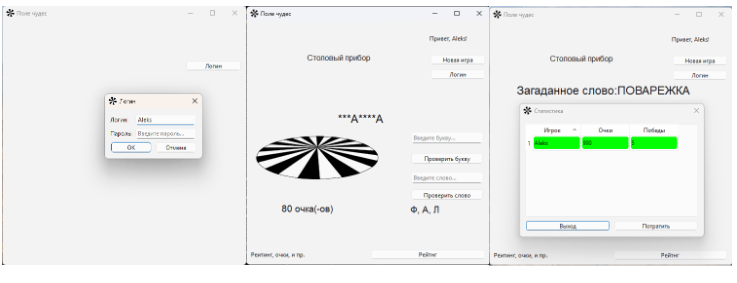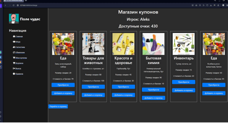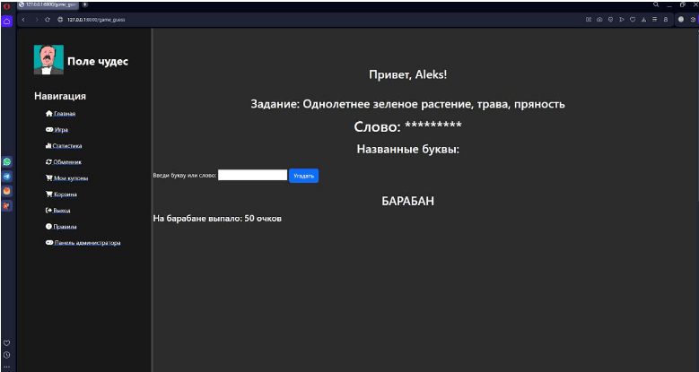 Проект реализован на Django с БД PostgreSQL. Включает три подсистемы: Игровая — классическое «Поле чудес»: угадывание слова по описанию, вращение барабана, очки, призы Магазин купонов — выбор и обмен накопленных очков на скидки из доступного ассортимента Административная — управление словарём, настройка коэффициентов сложности, анализ статистики и обратной связиАрхитектура: Спроектирована логическая схема БД (сущности: пользователи, игры, слова, купоны, жалобы, статистика) Реализована ролевая модель с разграничением доступа Разработана кастомная админка для не-технических пользователей Подготовлены тестовые сценарии и пользовательские историиТехнологии: Python, Django, PostgreSQL, HTML/CSS, JavaScript (AJAX), Git