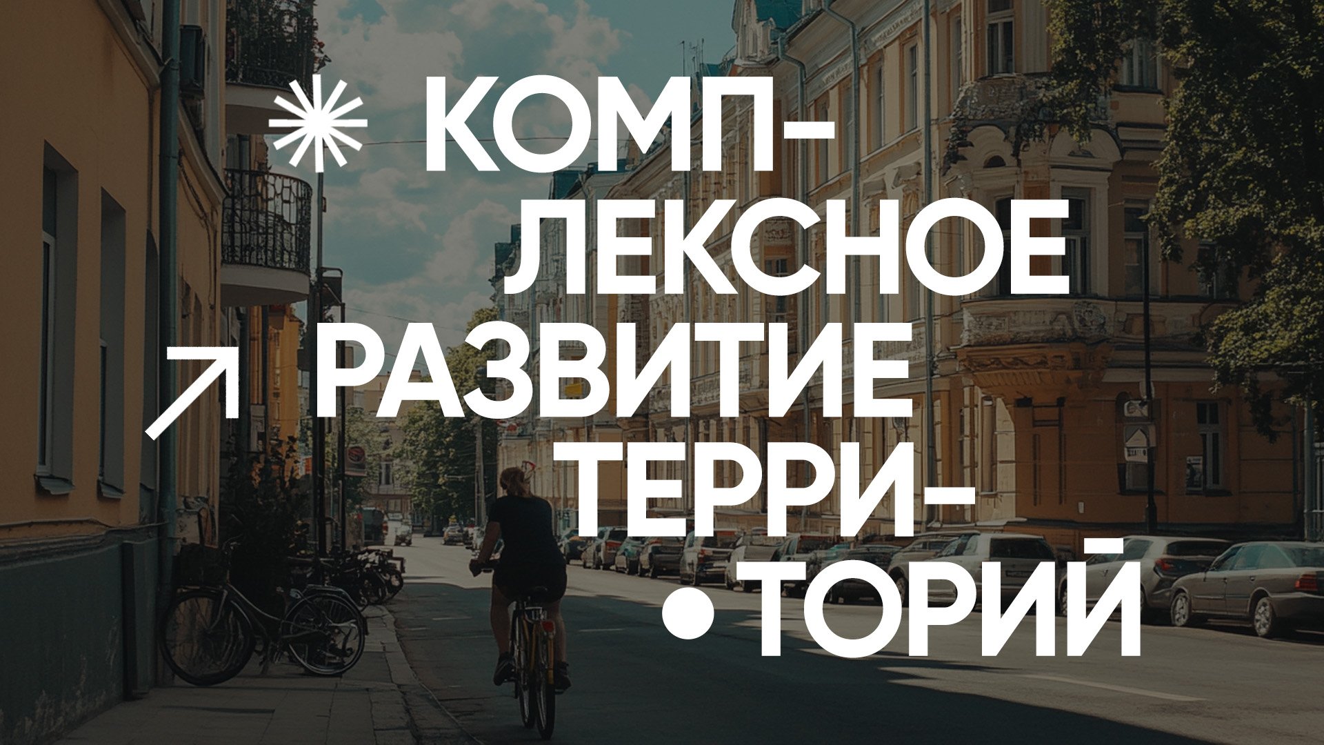Комплексное развитие: реальные кадры города — велосипедист, свет и воздух как символ полноценной жизни.