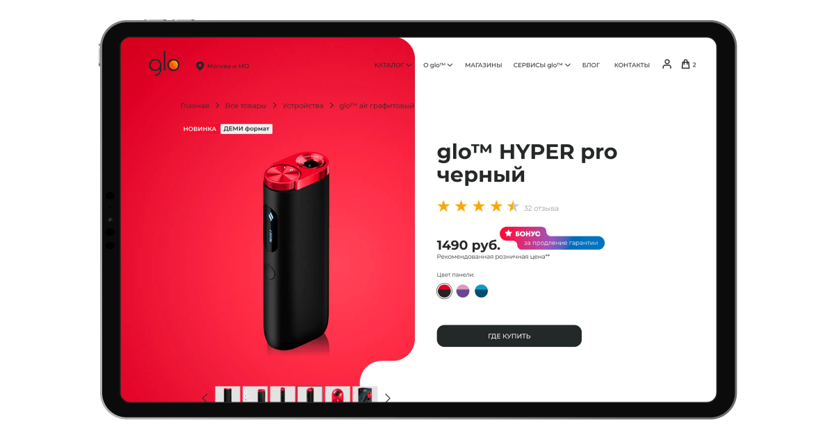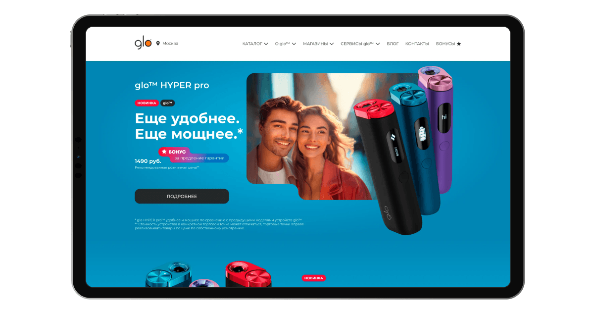 Нашей задачей было создать промо-сайт для нового устройства GLO HYPER PRO с акцентом на его преимущества, а также: