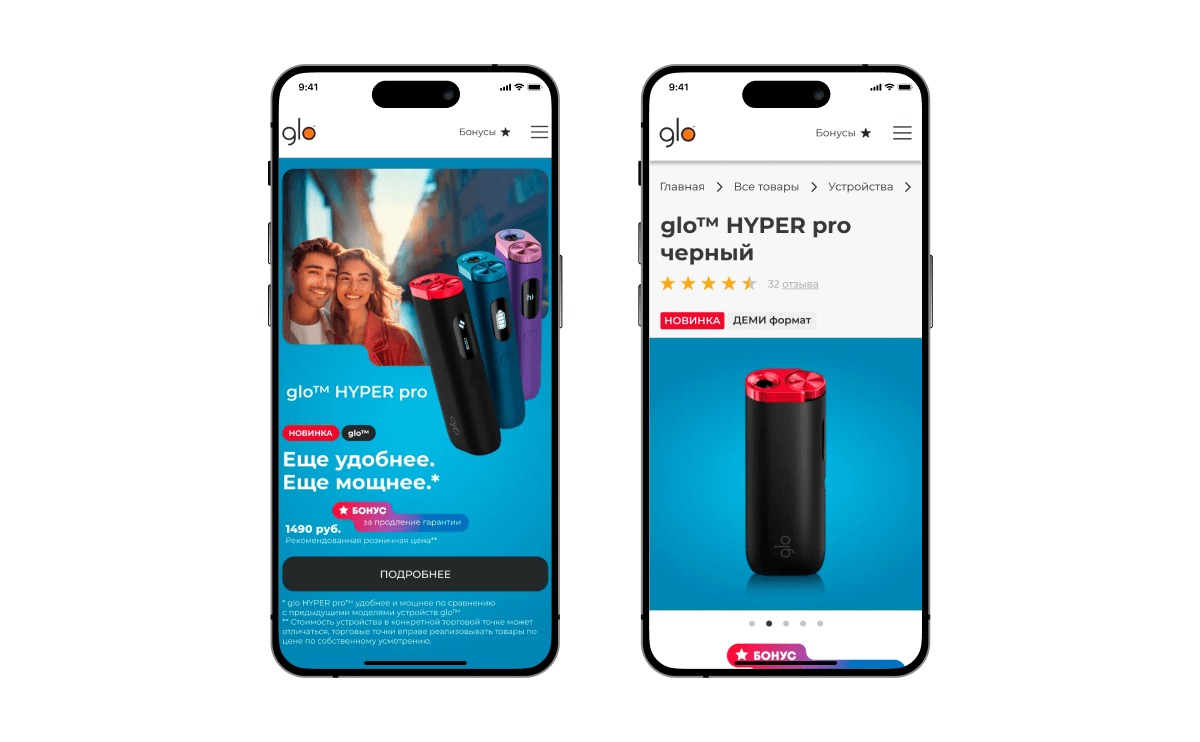 Промо-сайт GLO HYPER PRO стал идеальной площадкой для презентации нового устройства, сочетая стильный дизайн, информативность и интерактивные функции. Решения Mygento обеспечили вовлечённость пользователей и повышение эффективности бонусной программы, что подтвердило нашу экспертизу в digital-решениях для инновационных продуктов.