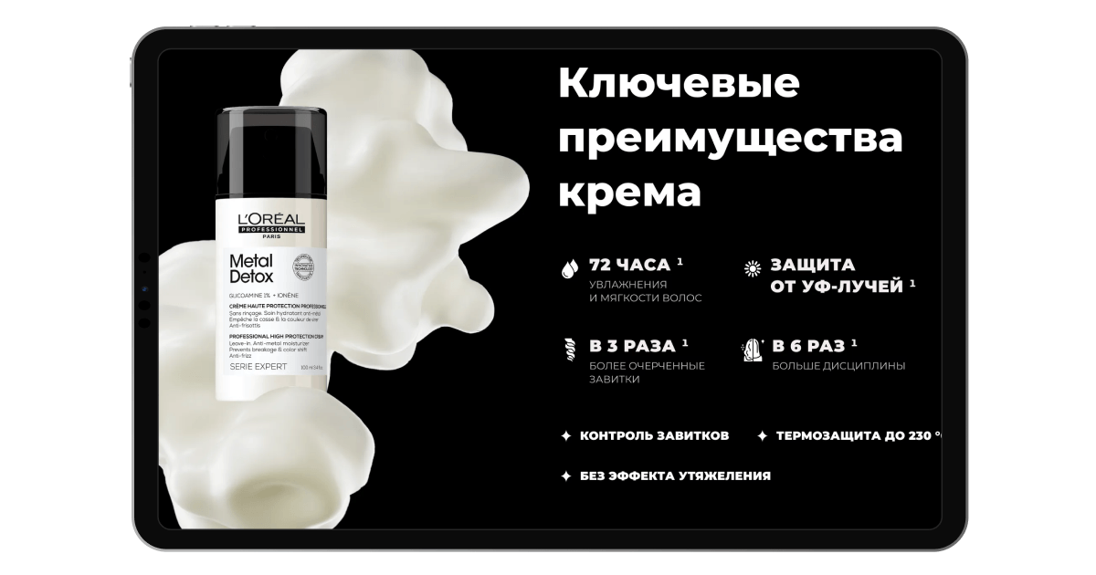 Дизайн промо-сайта подчеркнул ключевые преимущества продуктов Metal Detox, такие как защита волос от ломкости и сохранение насыщенности цвета. Мы использовали крупные изображения, текстуры продуктов и интерактивные блоки для демонстрации их свойств и применения.