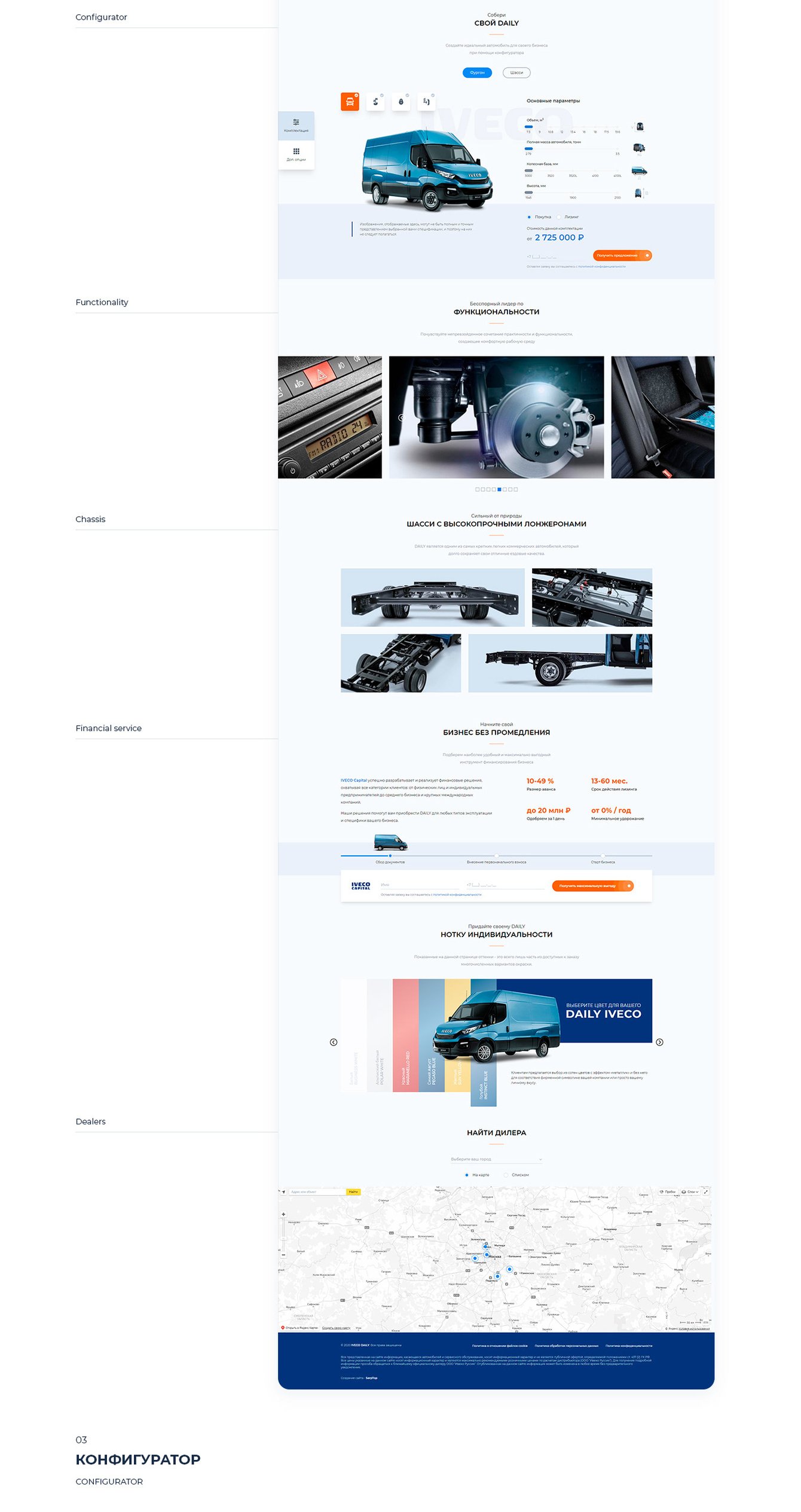 Разработать промо-сайт для презентации обновлённой модели “Iveco Daily” от компании “Iveco”. Сайт должен был подчеркнуть преимущества автомобиля, такие как лёгкость, комфорт, вместительность и эстетичность, и обеспечить удобство взаимодействия для потенциальных клиентов.