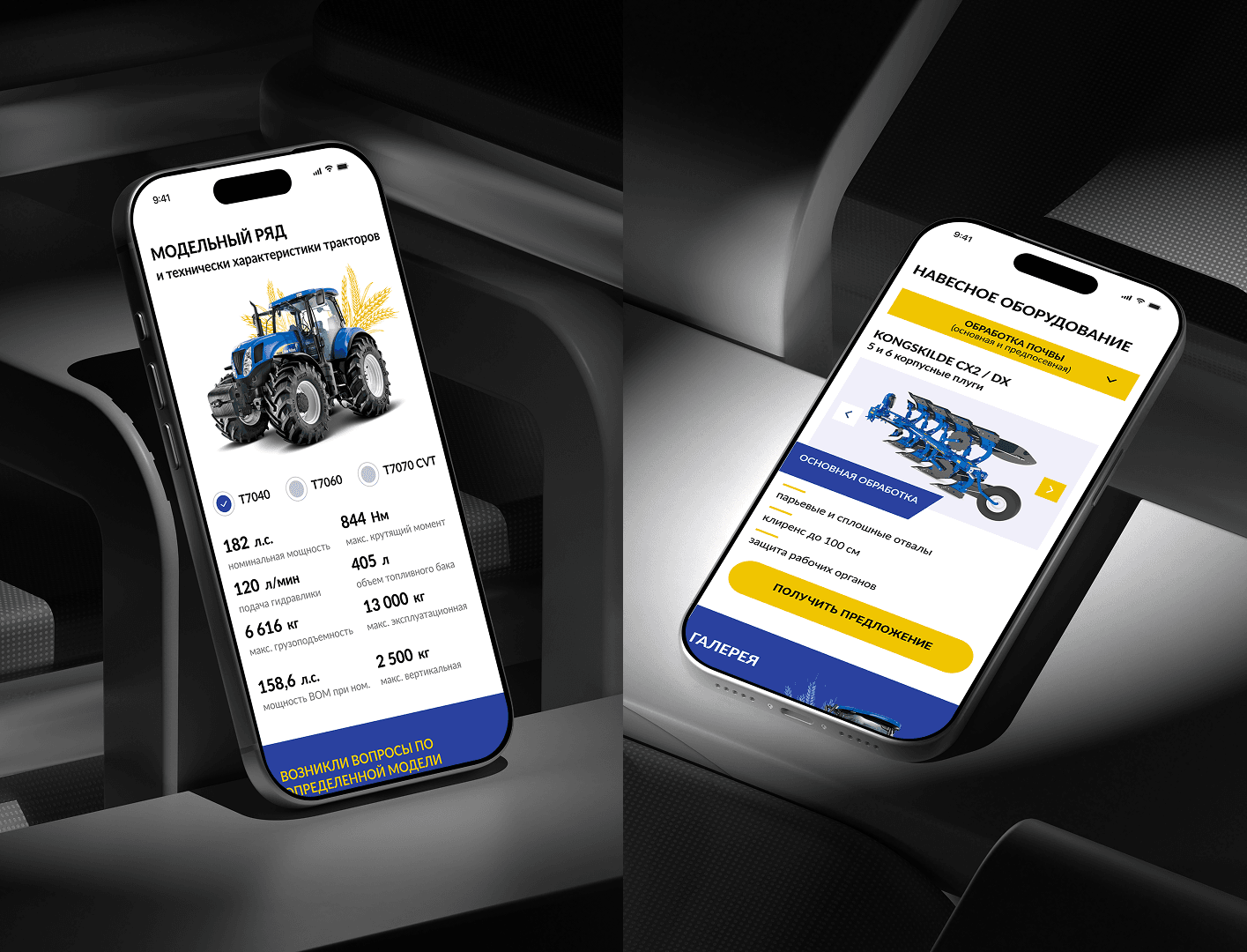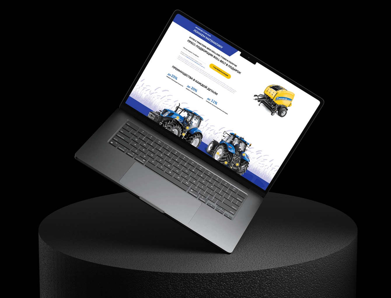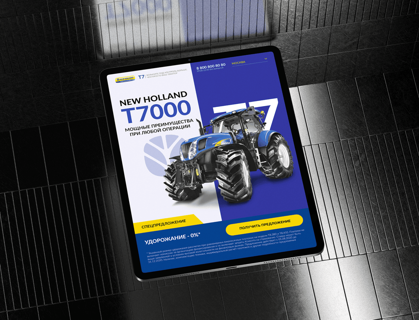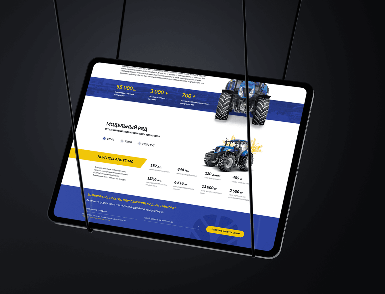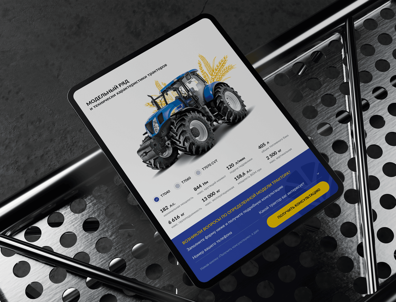 Разработать промо-сайт для компании «New Holland», представляющей модель сельскохозяйственного трактора “T7”. Сайт должен был подчеркнуть преимущества трактора, такие как инновационные технологии, экологичность и производительность, и обеспечить удобство взаимодействия для потенциальных клиентов.