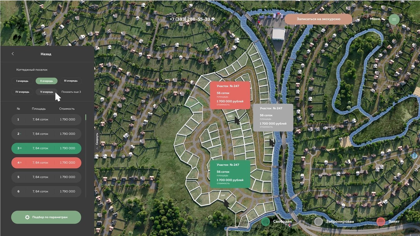 Реализовали уникальную механику выбора участков: на странице одновременно доступен и графический интерфейс в виде схемы участков, и расположенный в левом меню список участков с параметрическим выбором и фильтрацией.