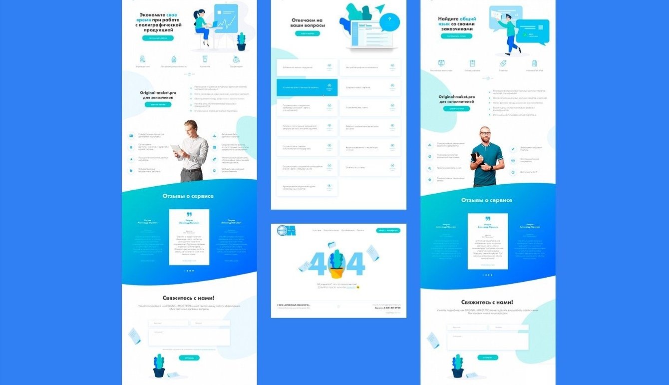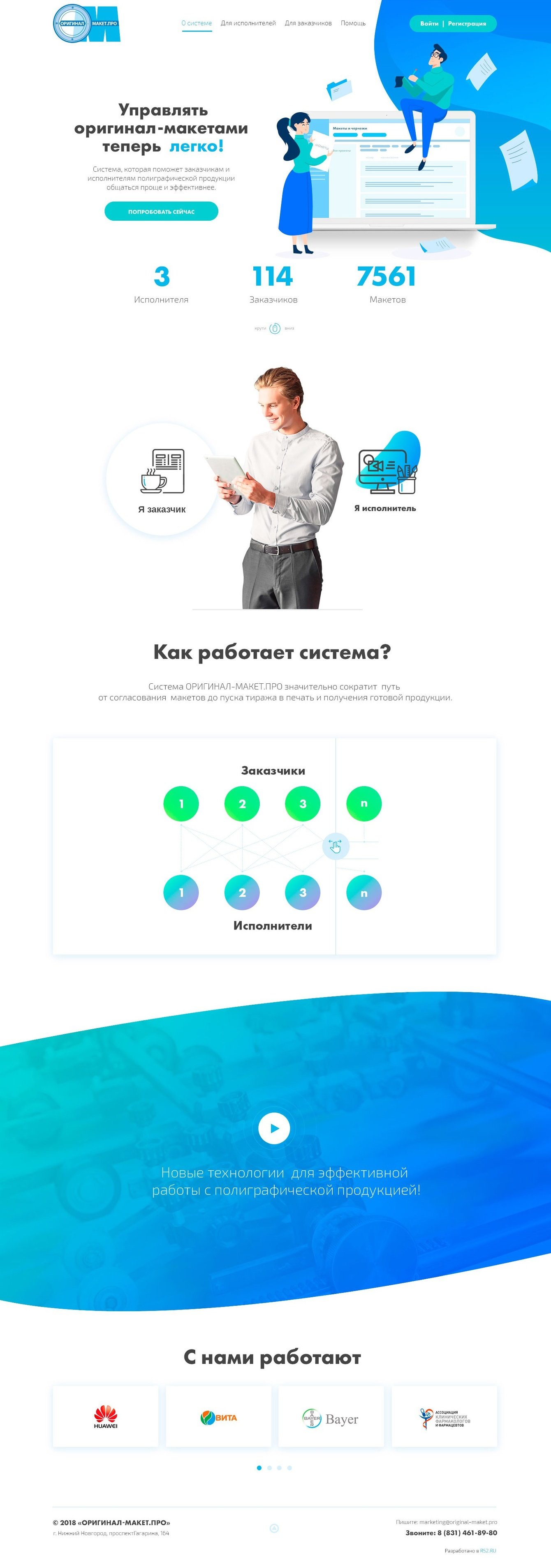 Сайт небольшой, всего четыре страницы. Главное действие - разделить поток пользователей на целевые группы: заказчики печатной продукции и исполнители. После разделения рассказать каждой из групп о всех возможностях продукта