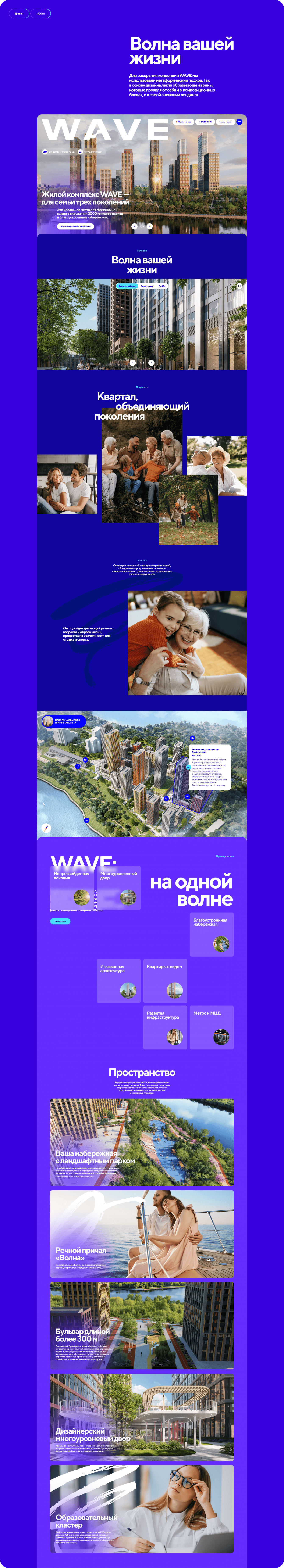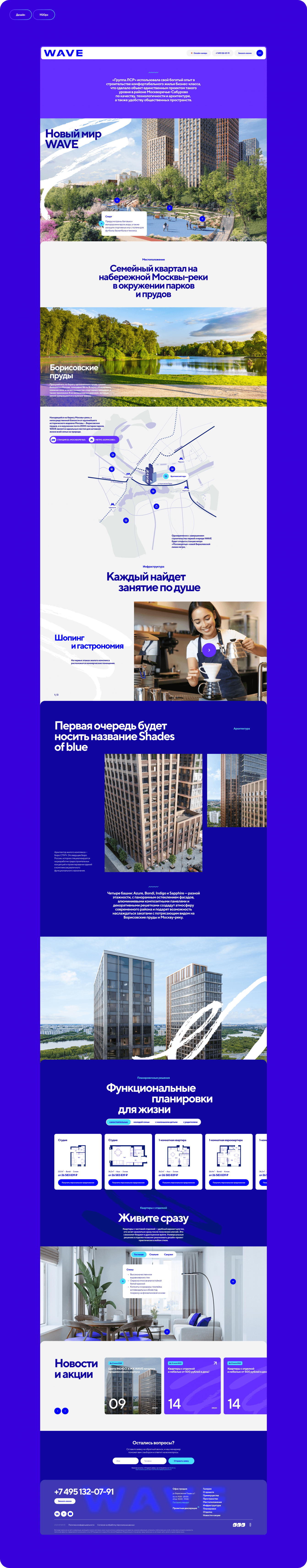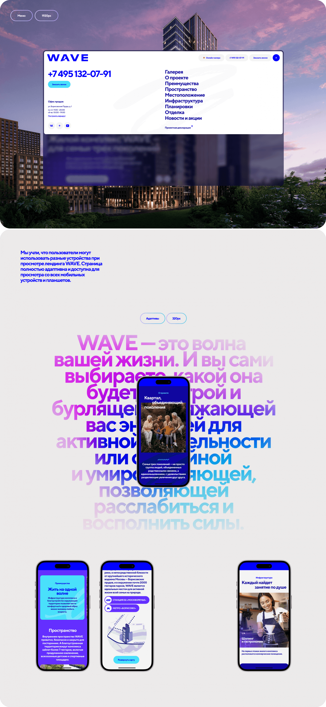 Мы разработали промо-сайт для жилого комплекса WAVE, который строится в Москве. Нам было важно раскрыть особенности и преимущества жилого комплекса и тем самым вызвать интерес у пользователей к проекту, а также подчеркнуть его особенный фирменный стиль.