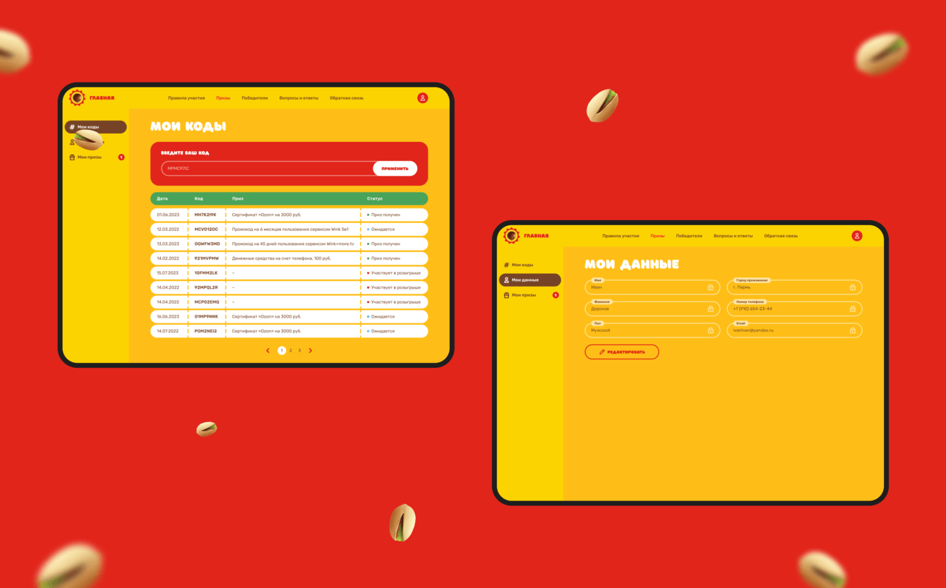 Участие в акции подразумевает регистрацию участника на сайте. Также пользователь может проверять полученные в рамках акции коды и их статус на сайте. Для этого нами был реализован необходимый функционал.