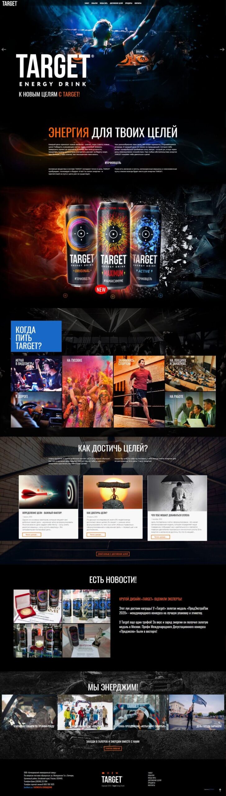 Дизайн сайта разработан в стиле бренда TARGET ENERGY DRINK, с использованием ярких цветов, динамичных элементов и запоминающихся изображений. Он мгновенно привлекает внимание и передает энергию бренда.