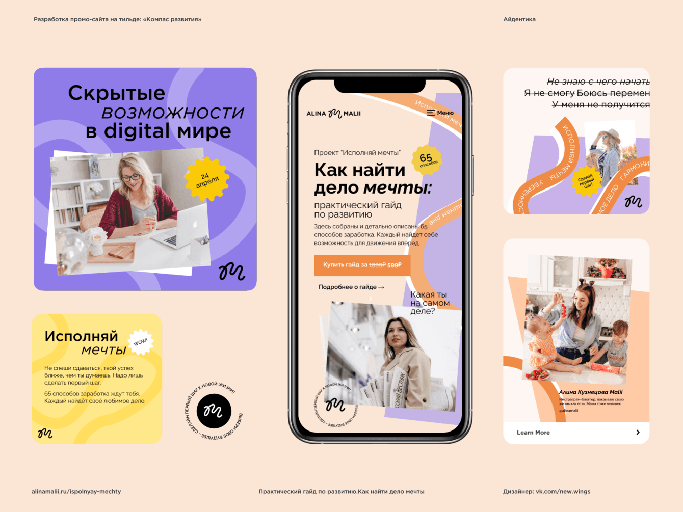 Разработать айдентику, рекламные форматы и лендинг для продвижения инфо-проекта блогера в социальных сетях: «Практический гайд по развитию.Как найти дело мечты»: здесь собраны и детально описаны 65 способов заработка. Каждый найдет себе возможность для движения вперед.