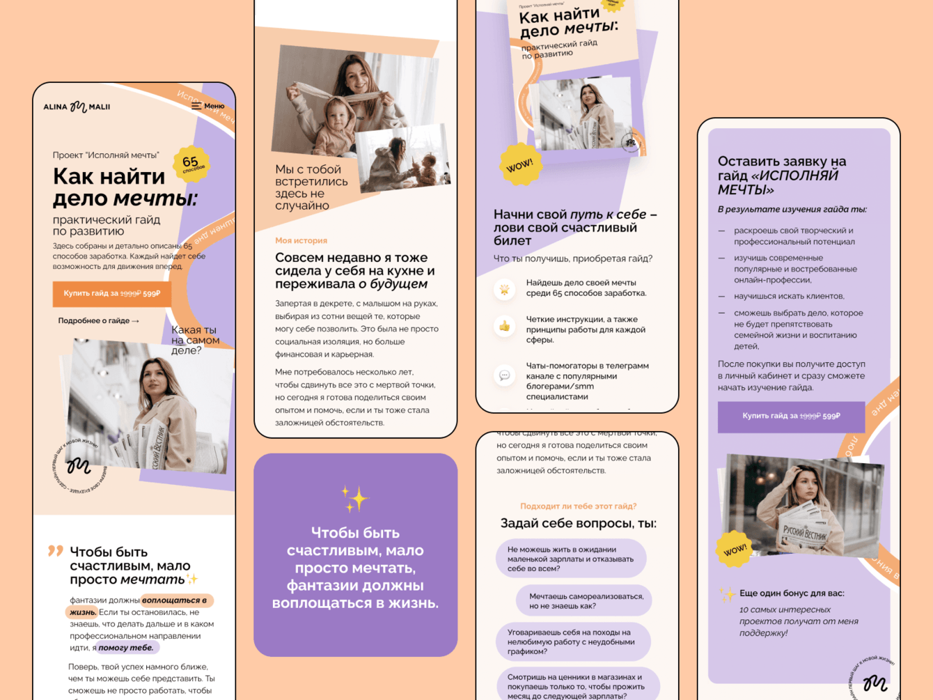 Разработать айдентику, рекламные форматы и лендинг для продвижения инфо-проекта блогера в социальных сетях: «Практический гайд по развитию.Как найти дело мечты»: здесь собраны и детально описаны 65 способов заработка. Каждый найдет себе возможность для движения вперед.