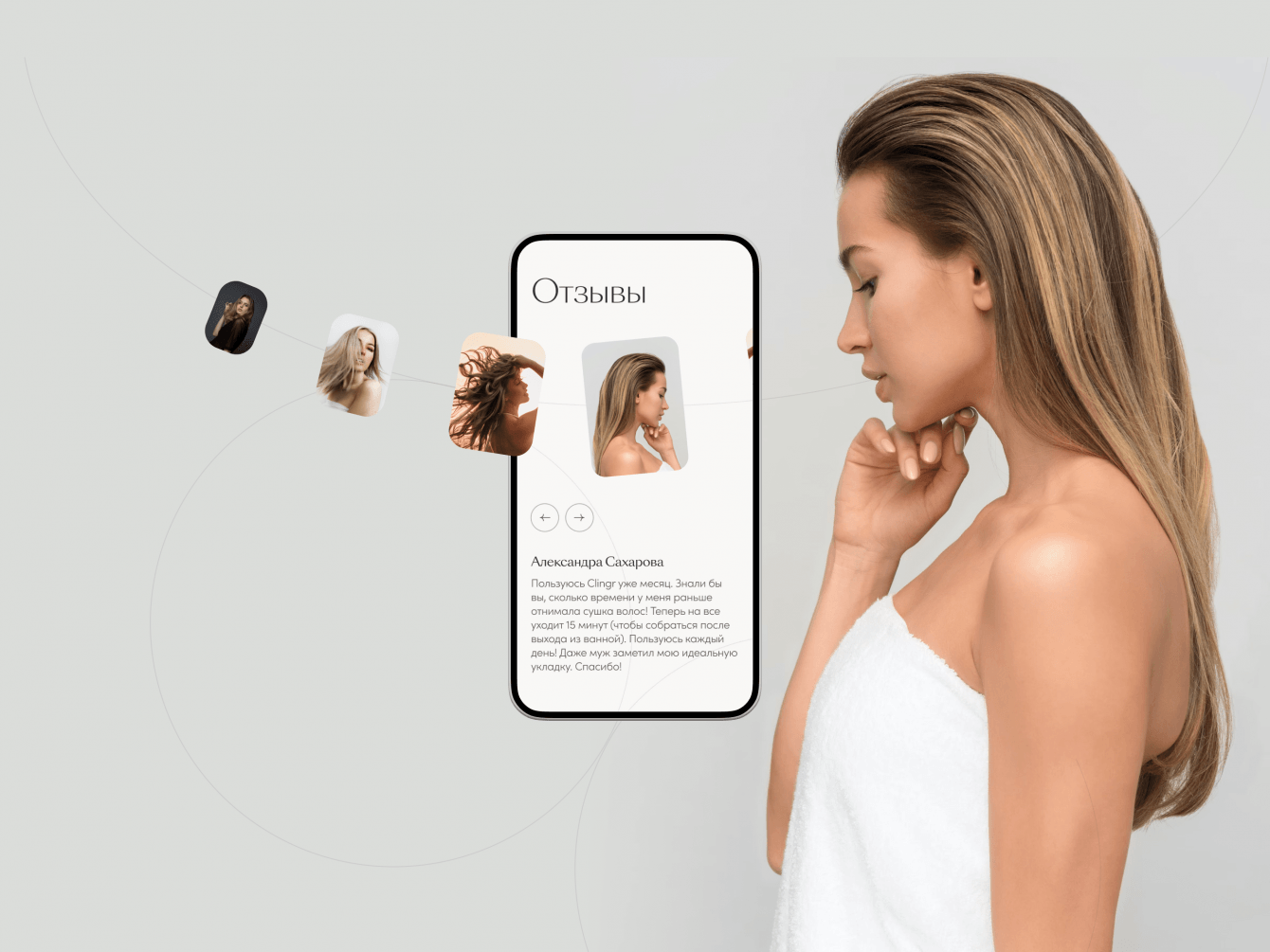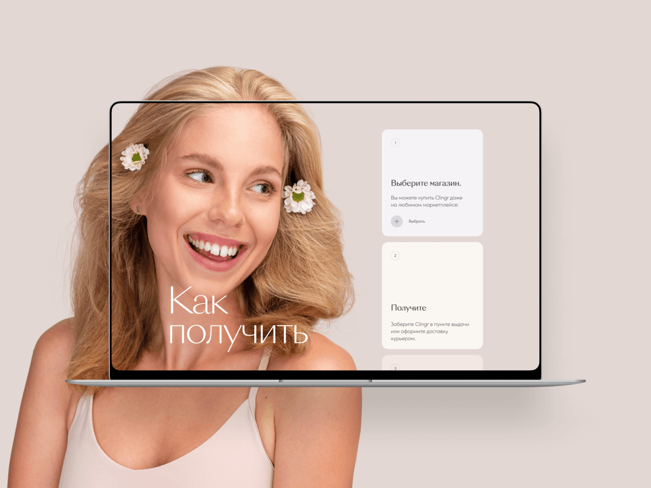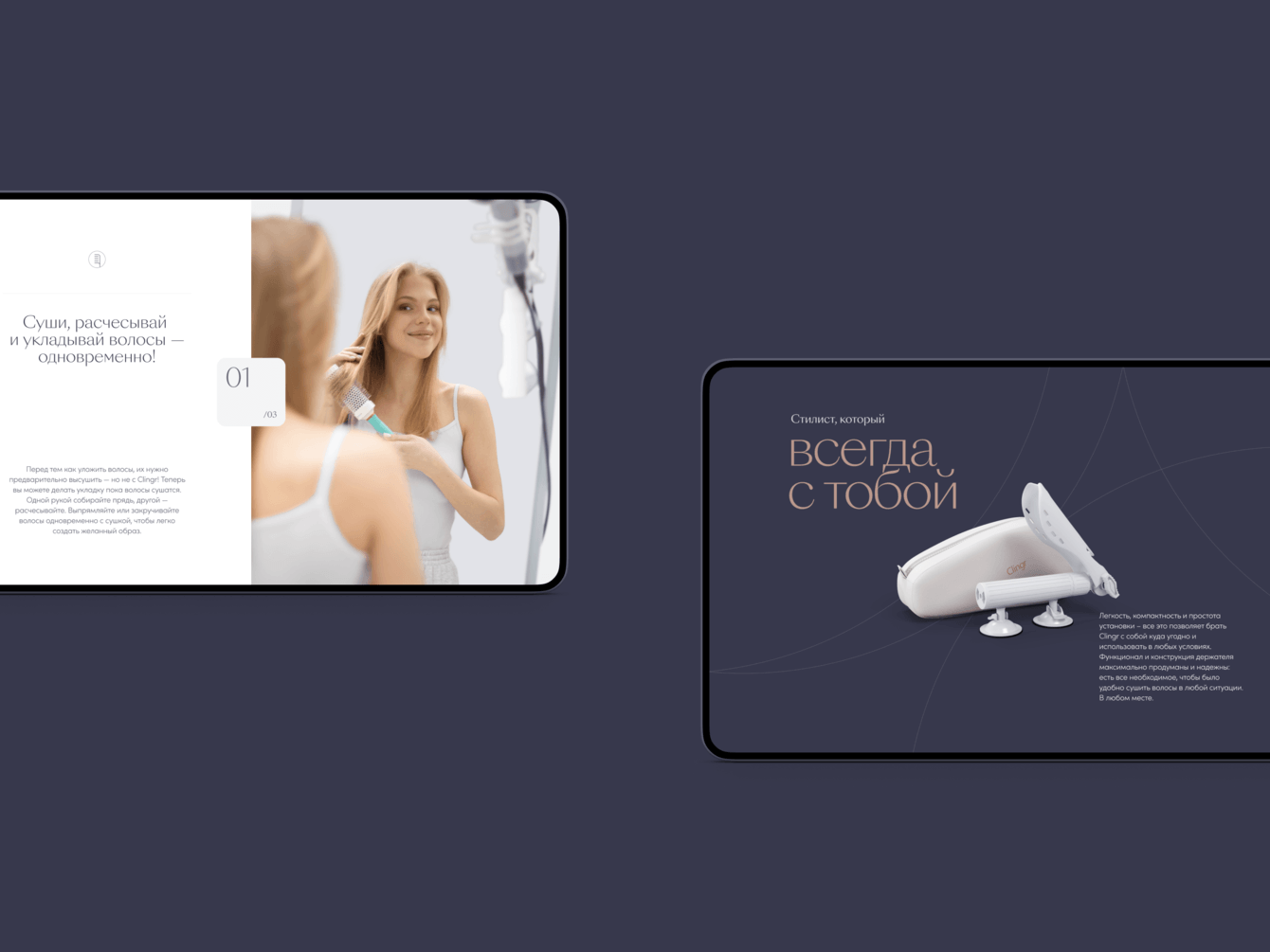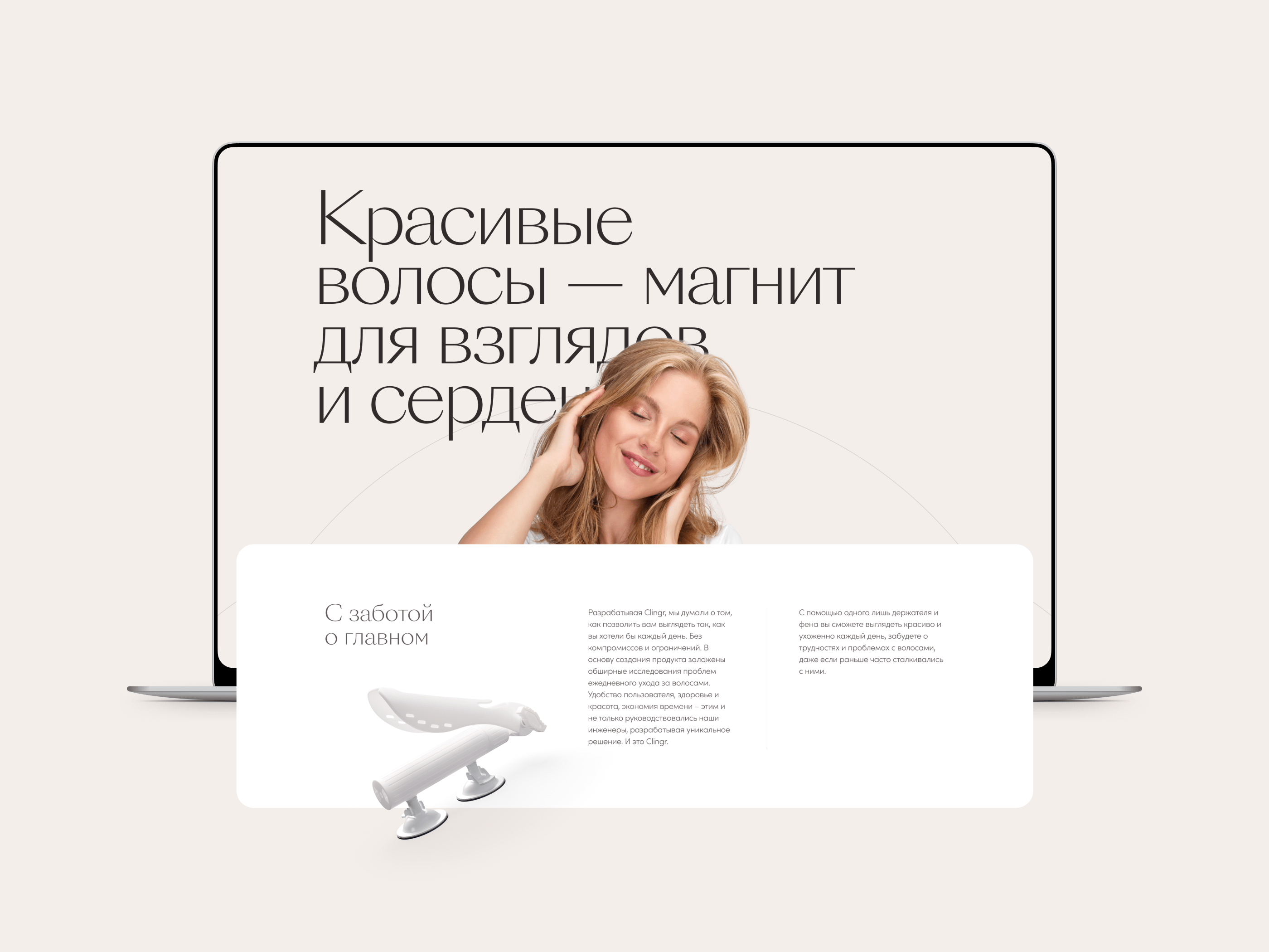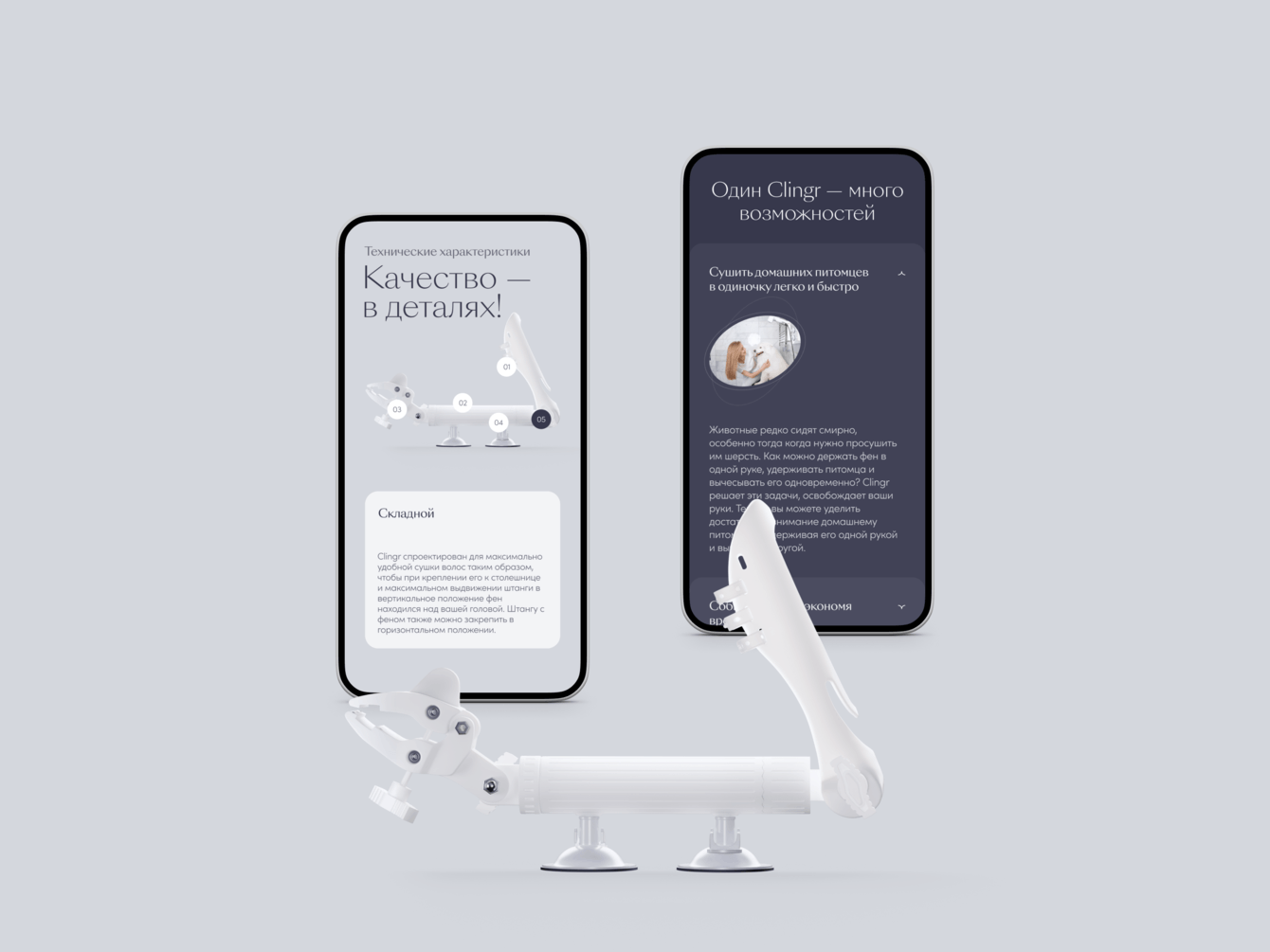 Двойной фокус: на презентации Clingr и изображении его счастливых владелиц — определил выбор визуальной стилистики. Минималистичный, спокойный, чистый дизайн выводит на первый план продукт и его обладателей.