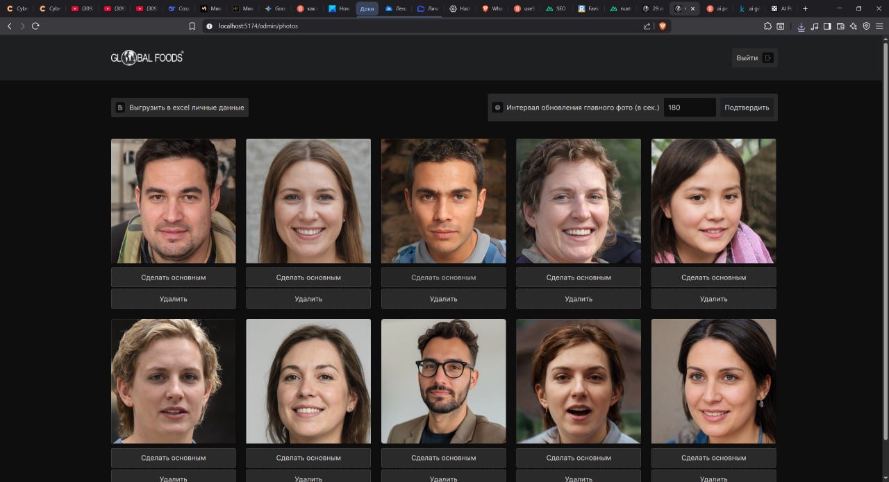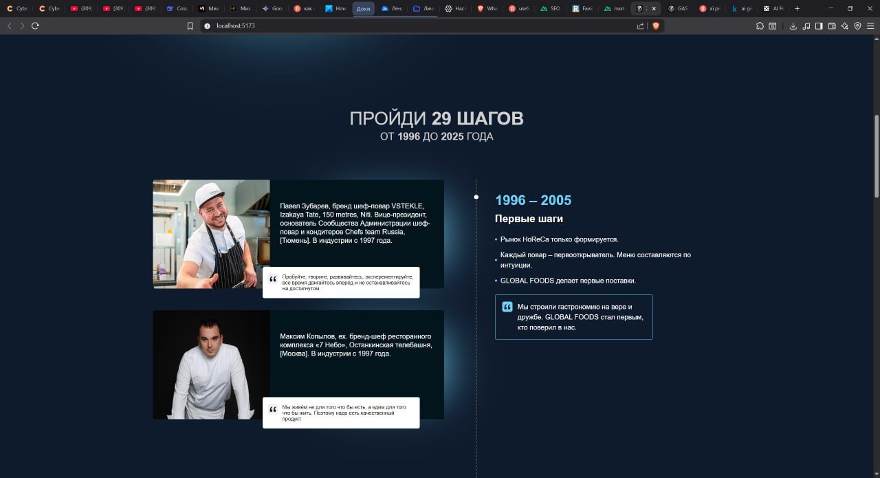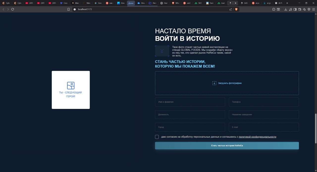 Техническое задание: Лендинг + QR-код + Вывод фото на экране Проект: Лендинг GLOBAL FOODS на GASTREET 2025 Цель: Создать цифровую механику, которая начинается с QR-кода на уличном стенде, продолжается на лендинге и завершается выводом фото посетителя на экране в финальной точке маршрута. 1. QR-код • Размещается на уличном стенде GLOBAL FOODS • Ведёт на лендинг по адресу: • Генерируется один универсальный статичный QR • Тестируется на всех типах устройств (iOS, Android) • QR-код дублируется на визитках и POSM при необходимости • Подпись к QR: «Сканируй — стань частью истории HoReCa» 2. Лендинг • Формат: одностраничный, адаптивный (приоритет — мобильные устройства) • Заголовок: «29 лет вкуса. Путь, который мы прошли вместе» • Подзаголовок: «Пройди 29 шагов — от 1996 до 2025 года. Загрузи фото — стань частью истории рынка HoReCa.» • Блоки: - История развития индустрии HoReCa с 1996 по 2025 (визуальный таймлайн) - Интерактивная форма для заполнения: * Имя, Фамилия * Город * Название заведения * Должность * Телефон * Фото (до 20 Мб) - Подтверждение отправки (экран/всплывающее окно): «Ты сделал первый шаг. Коридор вкуса ждёт тебя...» • Дизайн: стилистика референсов technotext.habr.com, цветовая гамма — тёмный фон, белый текст, акцентные детали GLOBAL FOODS 3. Вывод фото на экране • Локация: финальная точка маршрута на стенде внутри (№4.1) • Механика: - Фото, загруженное пользователем, отправляется в базу - Каждые 1–2 минуты база обновляется, и фото появляются на экране - Отображение в формате: * Мозаика * Слайд-шоу * Таймлайн истории - Под фото: Имя, Город, Заведение • Опционально: возможность модерировать фото через админ-панель