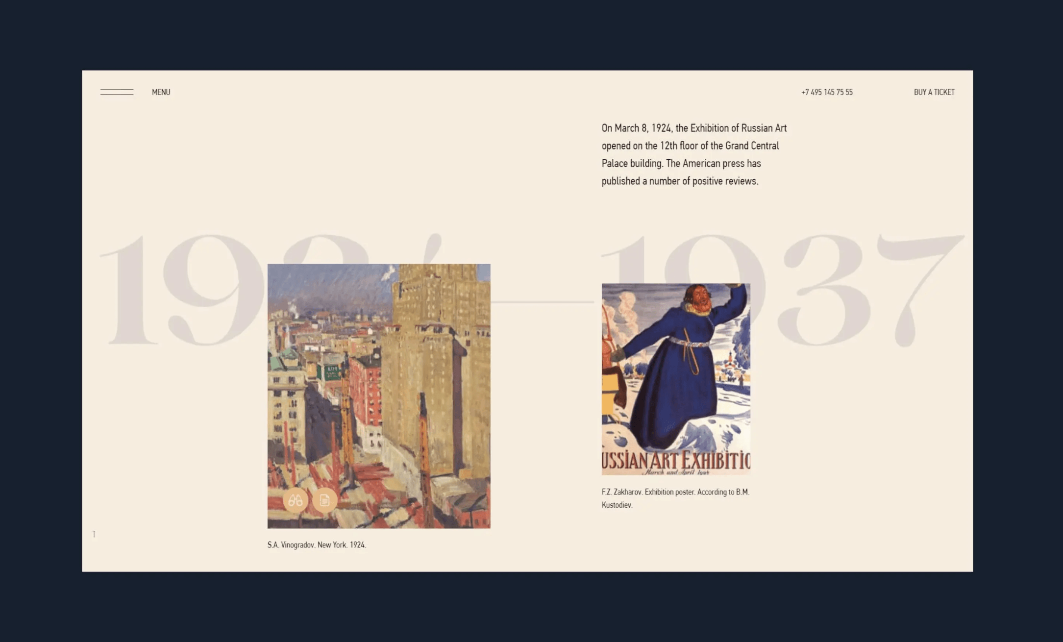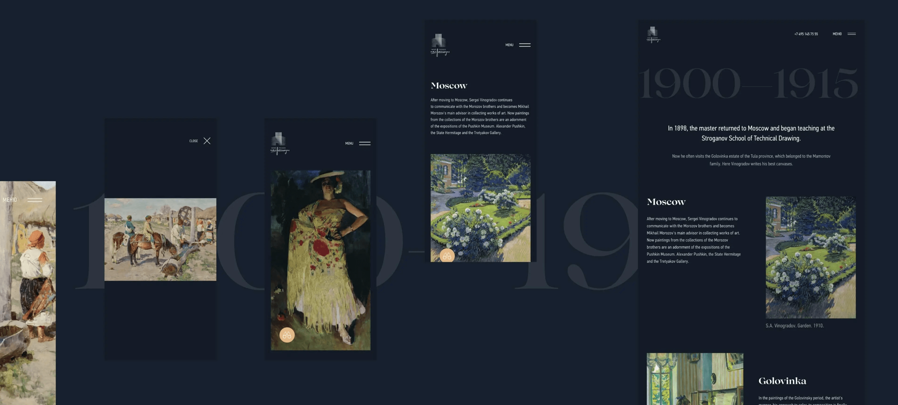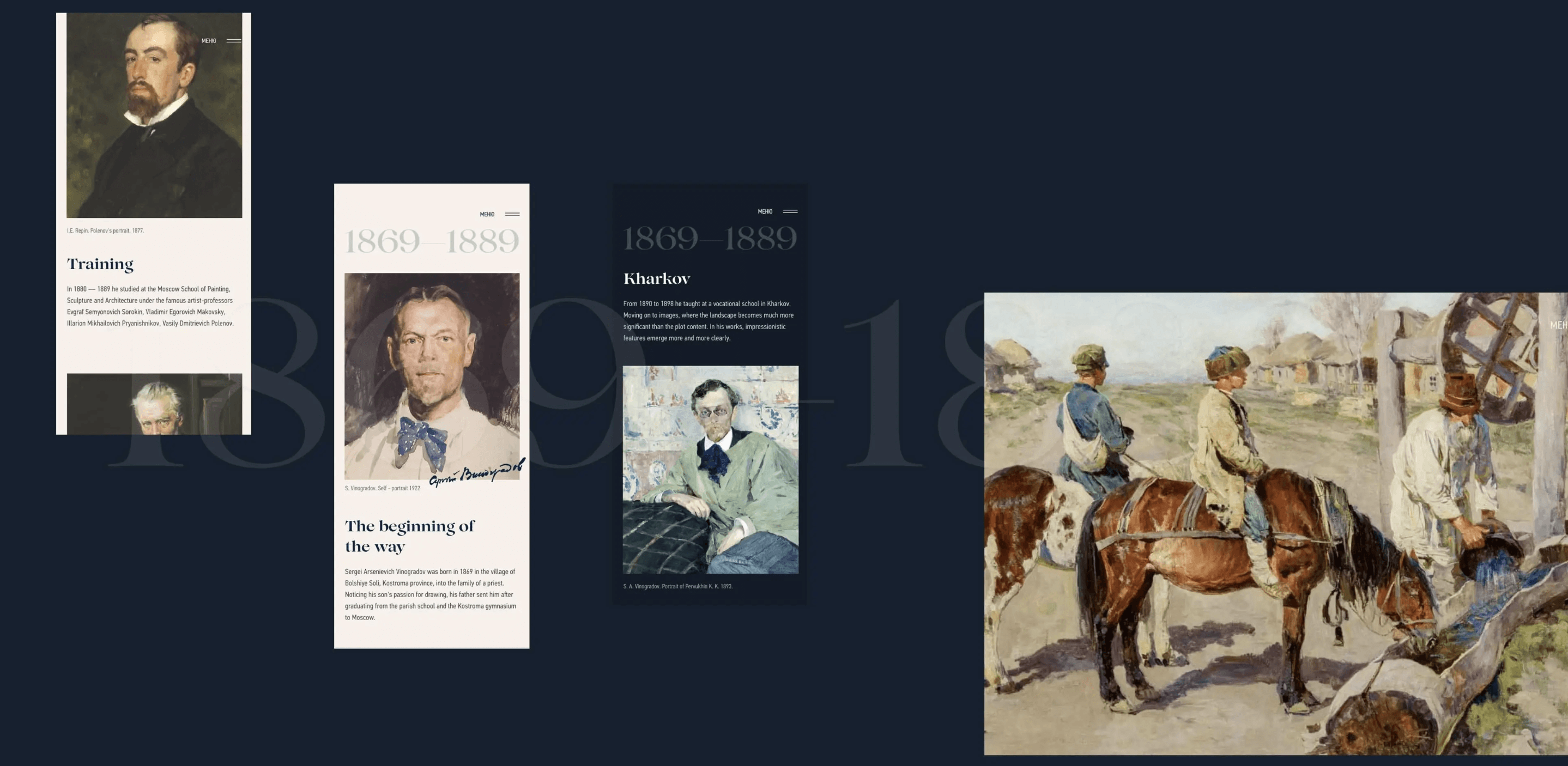 На сайте мы выбрали хронологический таймлайн. При просмотре параллельно с биографией художника появляются картины. У зрителя есть возможность посмотреть каждую из картин в увеличенном масштабе с сохранением качества изображения. Каждая картина соответствует временному периоду, в который и была создана. Неспешное повествование о биографии и творчестве автора во всей полноте рассказывает не только о самой экспозиции, а о Сергее Виноградове, как о человеке.