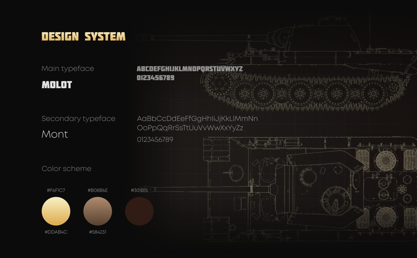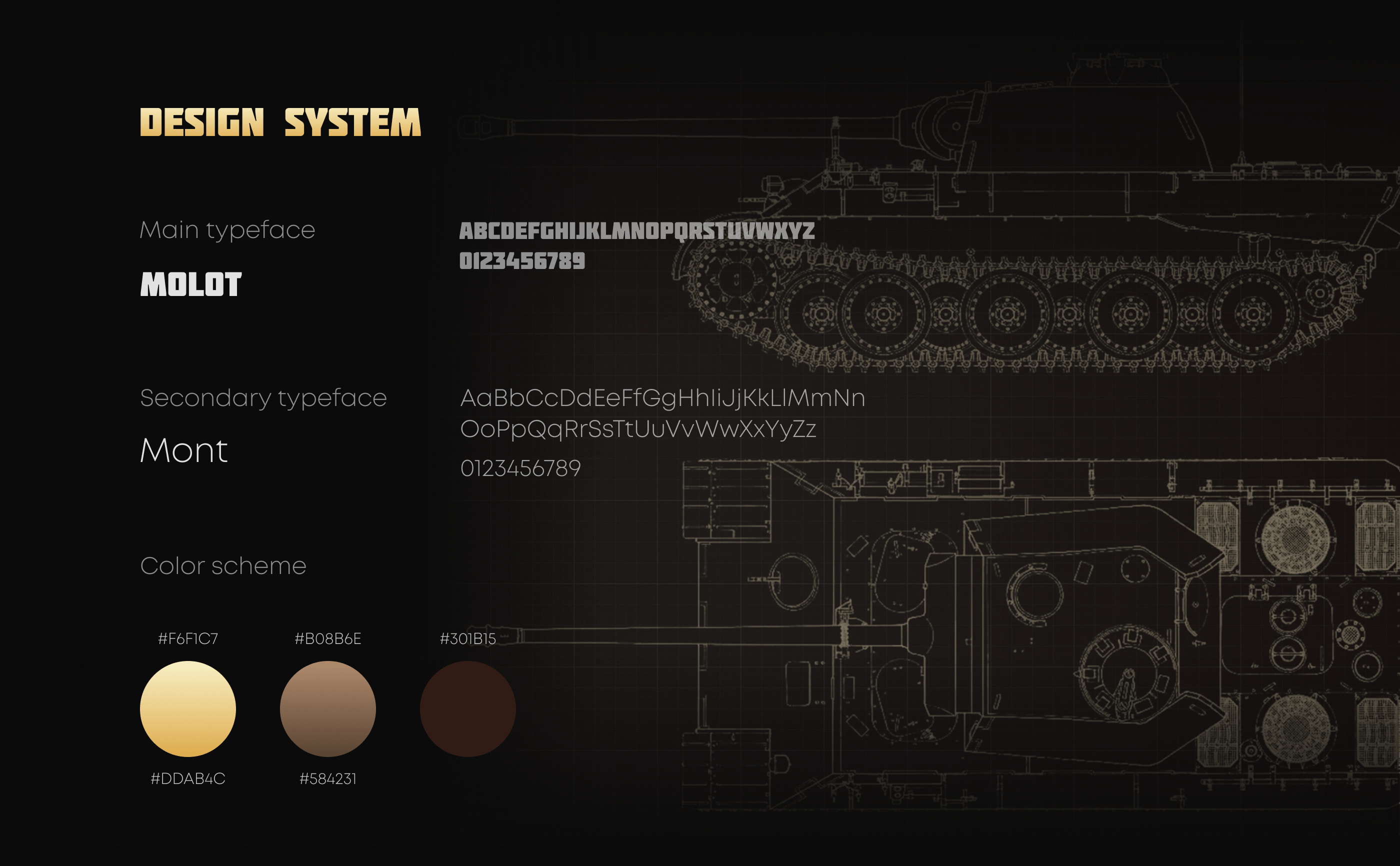 Проект создавался с упором на атмосферу Второй мировой войны: использовались аутентичные цветовые схемы (хаки, оливковый, стальной серый), винтажные шрифты и динамичные иллюстрации бронетехники. Дизайн продумывался так, чтобы сочетать минималистичную навигацию с эффектными визуальными акцентами.