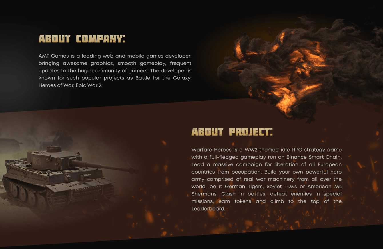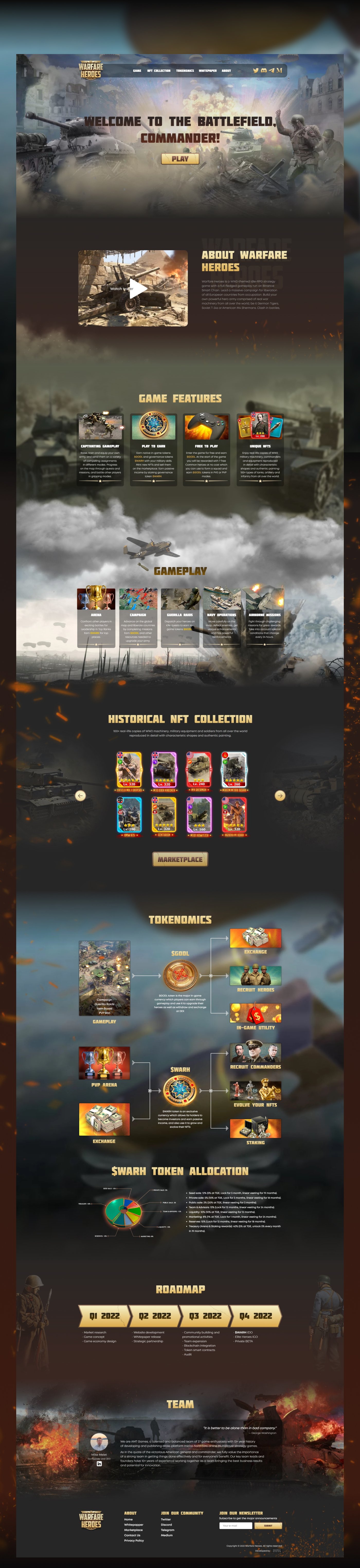 Warfare Heroes — это стратегическая idle-RPG в сеттинге Второй мировой войны с полноценным геймплеем на блокчейне Binance Smart Chain. Необходимо было разработать промо-страницу для презентации продукта на стадии предрелиза.